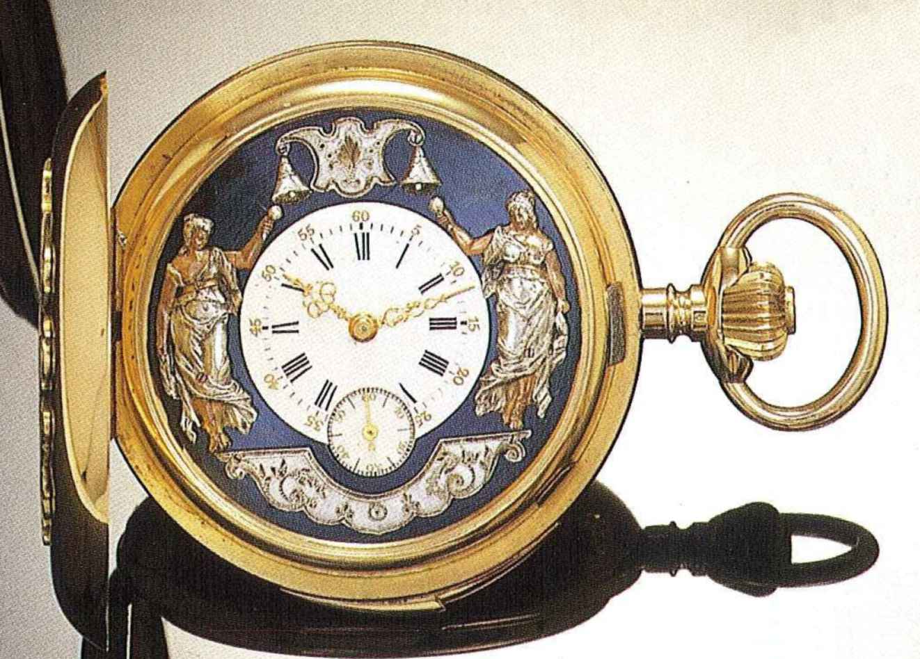 C. Four body, massive, "bassine", polished, the gold monogram "S.K." applied on the cover. Gold cuvette. D. Small white enamel with Roman numerals, outer gilt Arabic minute ring and sunk subsidiary seconds. Applied on the blued steel dial plate, automaton Jacks on each side of the dial, strike hours and quarters on belle above. Gold "Louis XV" hands. M. 18"', nickel plated, "fausses côtes" decoration, 29 jewels, counterpoised straight line escapement, cut bimetallic balance, Breguet balance spring. Repeating on gongs with slide in the band. In very good condition. Diam. 55 mm.