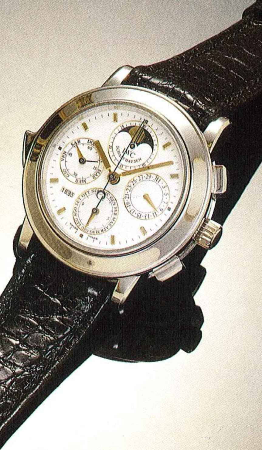 International Watch Co., Schaffhausen, " Grande Complication" No 33, produced in 50 examples only, made in 1992. Very fine and rare astronomie, minute repeating, waterproof, platinum gentleman's wristwatch with square button chronograph, registers, perpetual calendar and moon phases, with a large wooden fitted box and certificate.