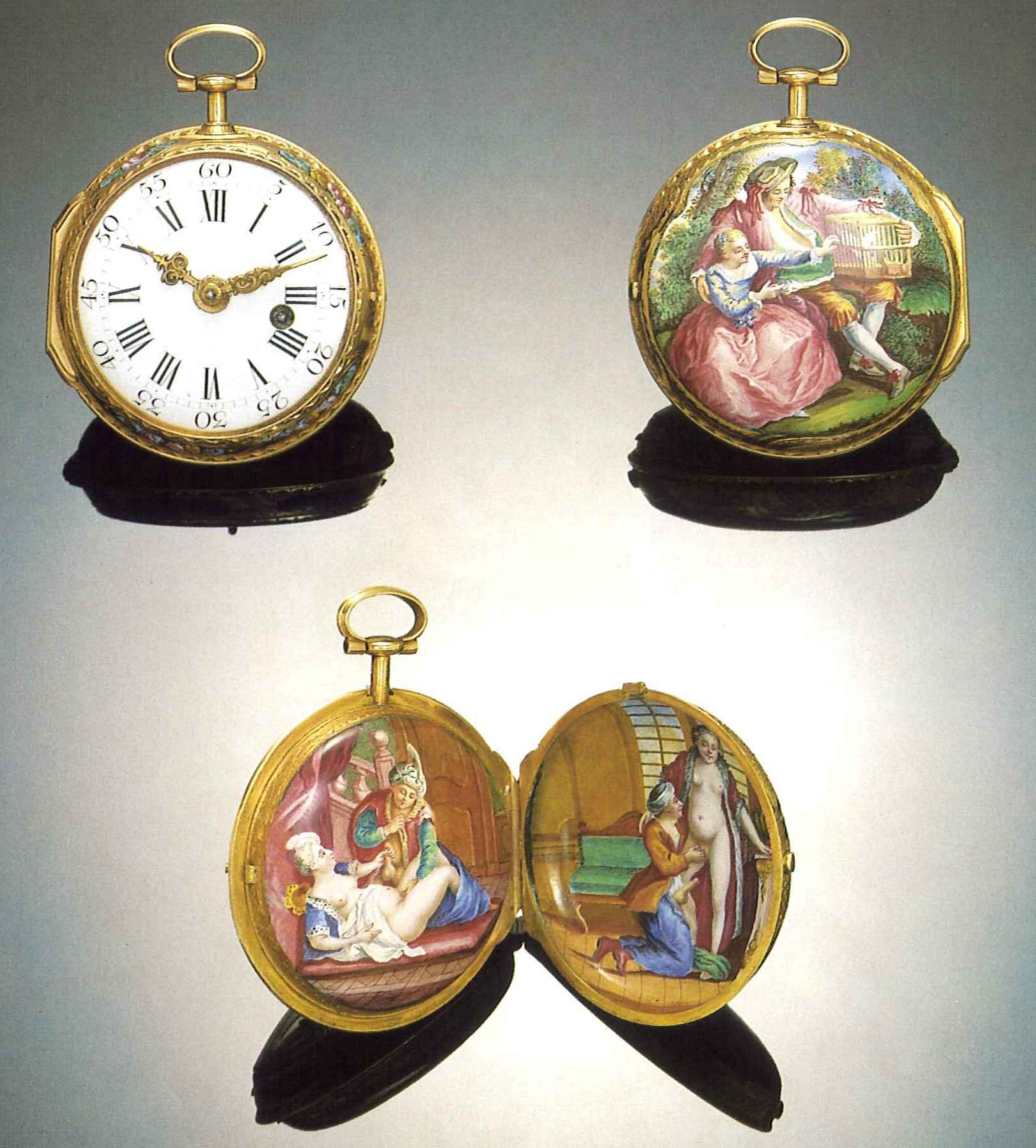 Bartholony à Paris, Swiss, circa 1775. Fine and rare 18 ct. gold and enamel watch with two concealed painted erotic scenes.
