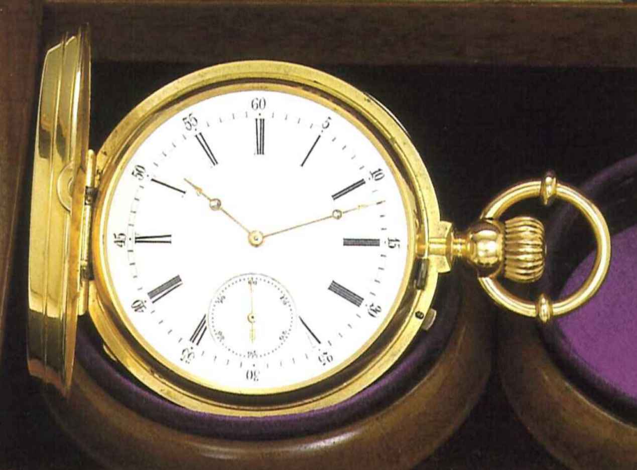 Jacot Frères, Locle (Swiss), No. 157196, made in 1873. Very fine and rare 18 ct. gold hunting cased, keyless pocket chronometer in original mahogany fitted box, with the original Bulletin de Marche delivered on 24 May 1873 by the Observatoire Cantonal of the République & Canton of Neuchatel, and a repair invoice dated 23 May 1838.