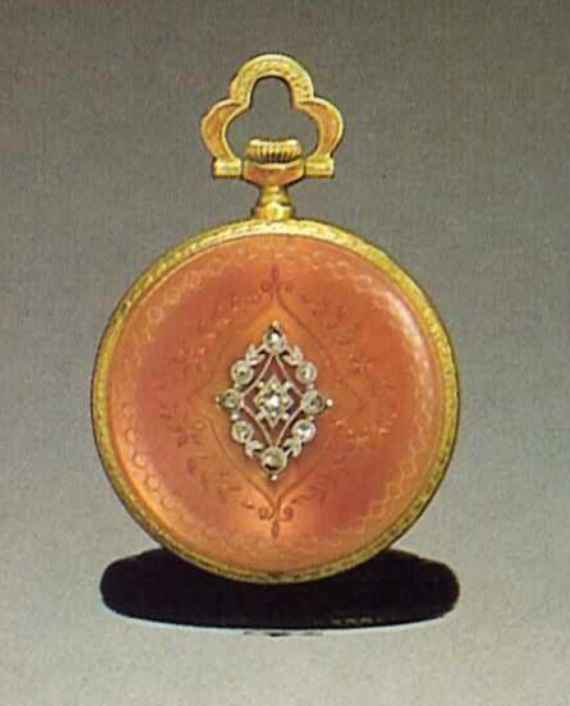 C. Three piece, massive, "bassine et filets", entirely enamel with pink translucent enamel over engineturning, the back applied with a rose-diamond set ornament,chased borders en reserve. D. Mat silver with Breguet numerals. Blued steel "spade" hands. M. 10"', rhodium plated, "fausses côtes" decoration, 17 jewels, straight line lever escapement, cut bimetallic balance, Breguet balance spring. Signed "E. Gübelin" on the dial, Haas tracte-mark inside the back. In very good condition. Diam. 28 mm.