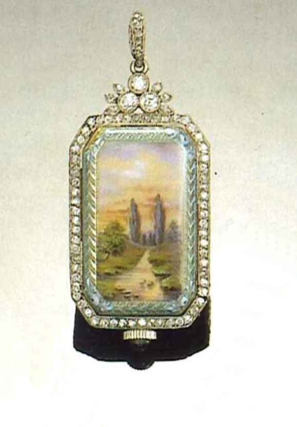 C. Three piece rectangular with cut-out corners, the bezel of translucent powder blue enamel over engine-turning (slightly restored), the enamel back with diamond-set border, painted with a river-side landscape within a translucent enamel frame matching the bezel. D. Pale blue enamel with Arabic numerals, centred with a painted urn of flower. Blued steel "spade" hands. M. 5"', rectangular three quarter plate, punched with the Geneva quality mark, 18 jewels, straight line lever escapement, cut bimetallic balance, Breguet balance spring. In good condition. Dim. 39 x 19 mm.