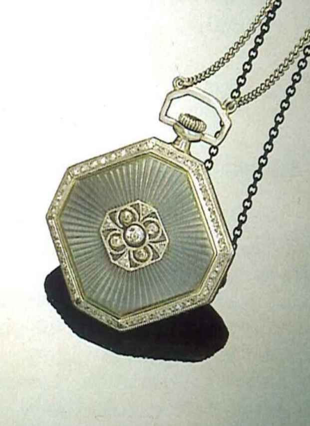 E. Gübelin, Lucerne, Swiss, circa 1920. Fine 18 ct. gold, platinum and enamel octagonal keyless diamond set pendant watch with matching chain.