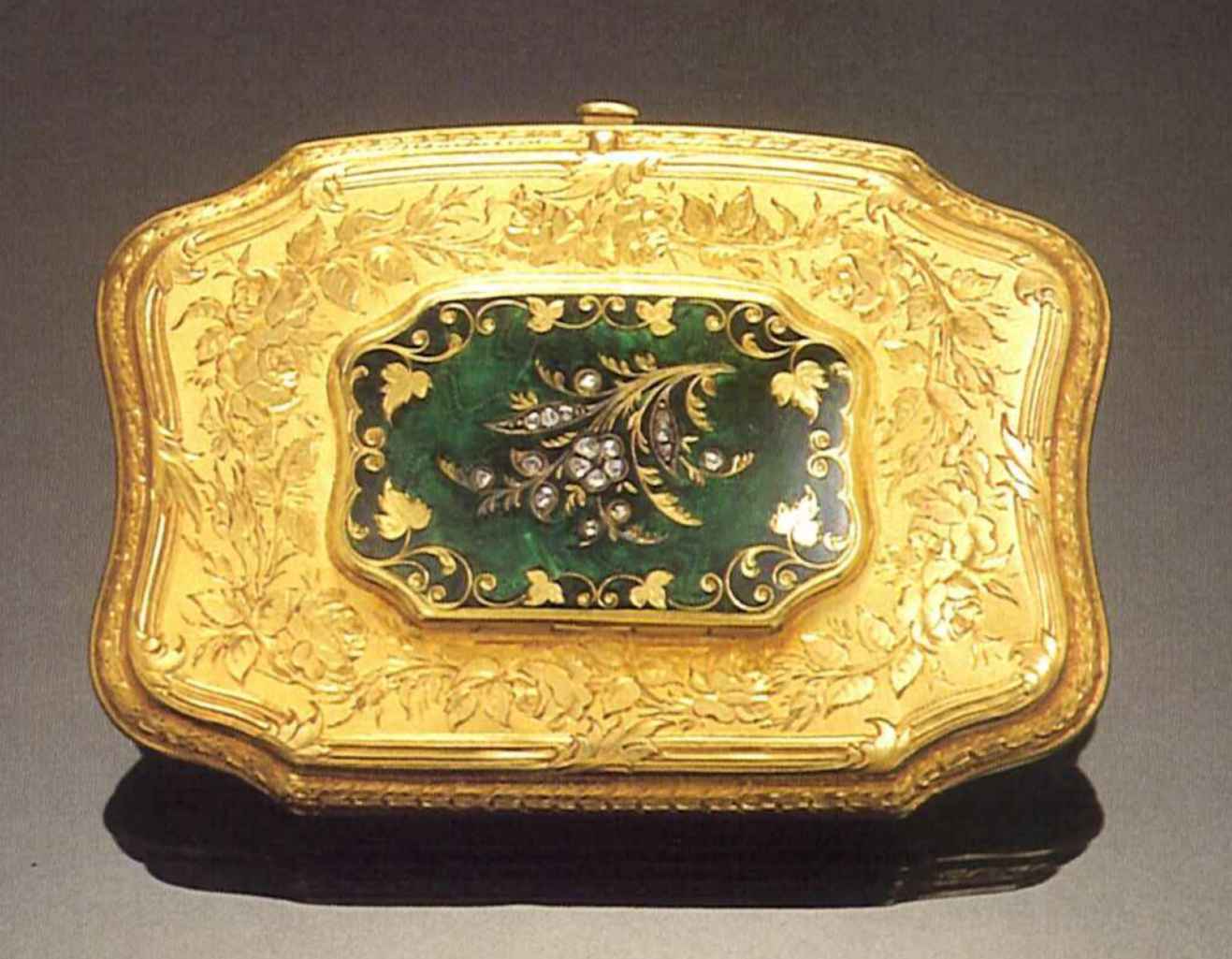 C. The movement is set on the cover of a fine gold purse engine-turned and engraved with garlands and bunch of roses, the watch cover of green translucent enamel over engine-turning, centred with a fine rose-diamond inlaid branch of flowers, the borders with engraved vine leaf decoration. D. White enamel with Roman numerals. Blued steel "spade" hands. M. Gilt brass, bar calibre with going barrel, eight jewels, cylinder escapement, plain brass three-arm balance, flat balance spring. In very good condition. Dim. 78 x 58 mm.