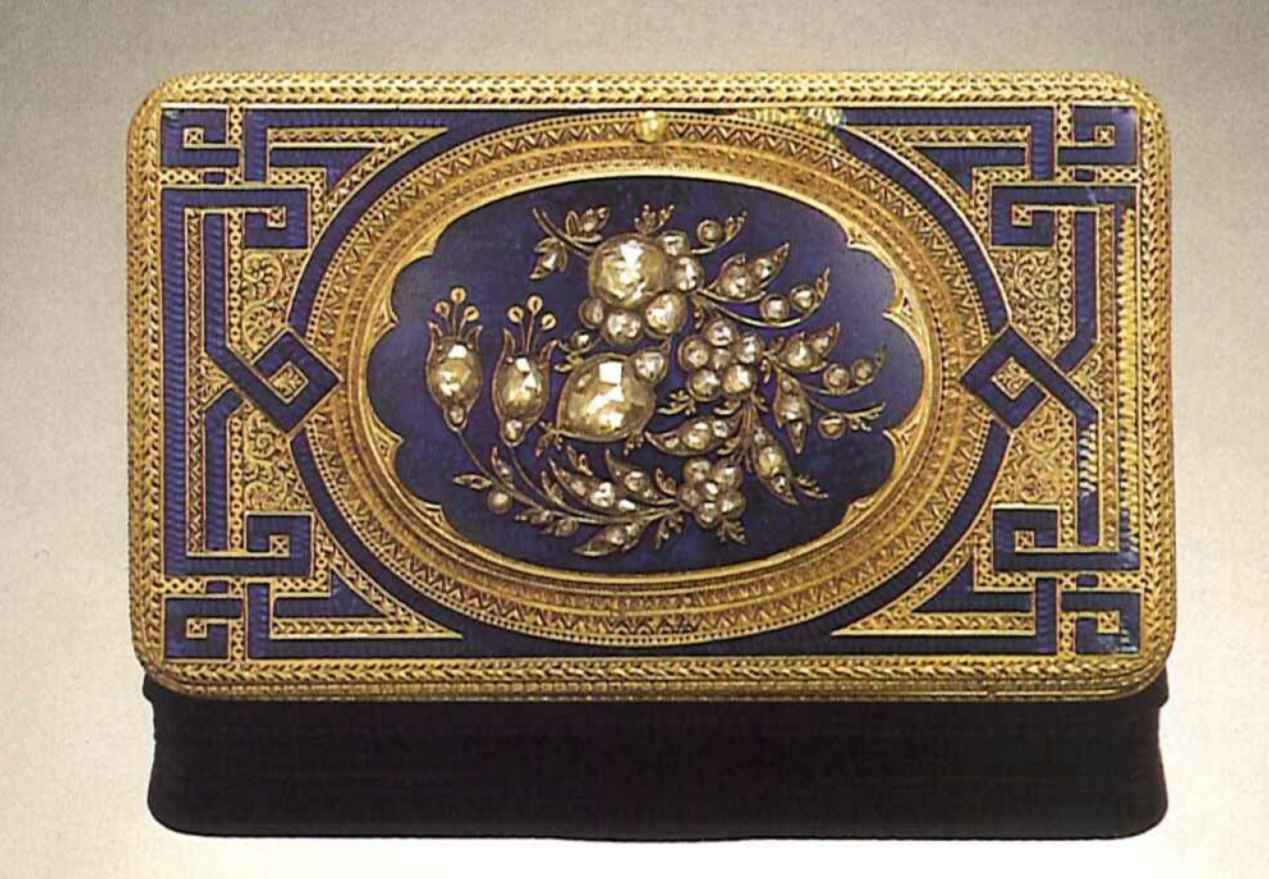 Courvoisier Frères, Chaux-de-Fonds, Swiss, circa 1850. Fine 18 ct. gold and enamel, diamond-set snuff box with a built-in watch.