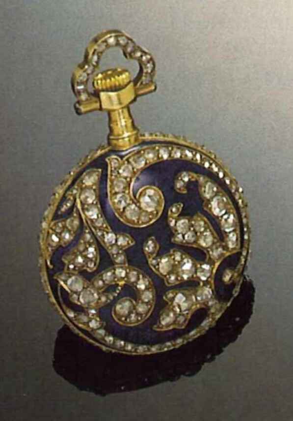 C. Three piece, massive, "bassine et filets, with diamond set band, bezel and back of dark Blue enamel with elaborate rose-diamond inlaid decoration. Gold cuvette. D. Blue enamel with white Roman numerals within a rosette and centred with a rose diamond inlaid decoration. Gold "Louis XV" hands. M. 9"', gilt brass, 8 jewels, cylinder escapement, plain brass three-arm balance, flat balance spring and regulator. Signed on the cuvette. In good condition. Diam. 28 nun.