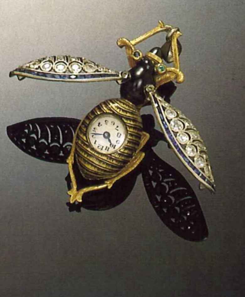 C. Three part, underside realistically chased and engraved with legs and underbody, wing covers entirely set with old cut diamonds and sapphire border, the thorax realistically decorated with black champlevé enamel lines, emerald set eyes; sprung loaded wing opens from a button in the base to reveal the dial. D. Mat silver with Arabic numerals. Blued steel "spade" hands. M. Oval 4 1/2-, nickel plated,17 jewels, straight lire lever escapement, cut bimetallic balance, Breguet balance spring. In vert' good condition. Dims. 37 mm. overall. 14 mm. vide.
