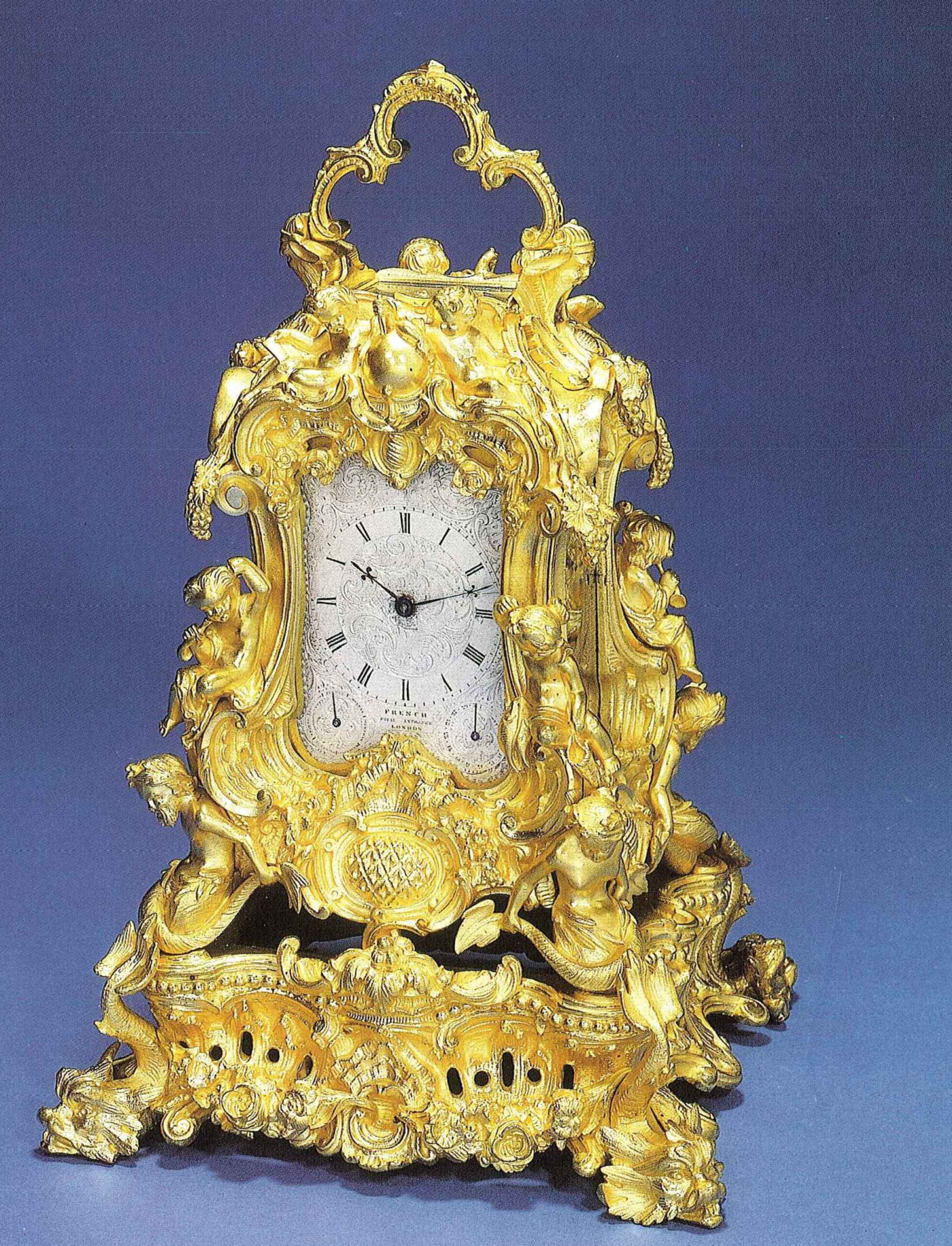 C. Gilt cast-brass, decorated all over in high baroque relief and with applied figures of putti, mermaids, mermen, dolphins and fish. Glazed four sides and top, ornate carrying handle. D. Brass, silvered and engraved in centre and spandrels, Roman chapters, " fleur de lys" hands, simple calendar showing day of week and date of month. M. Brass rectangular, fusee and chain, maintaining power, Earnshaw-type springdetent escapement, cut bimetallic balance, helical spring, diamond endstone to balance cock, strike/silent. Signed on dial and movement. In good conditon (one dolphin a replacement). Dim. 24.5 x 18 x 16.5 cm.