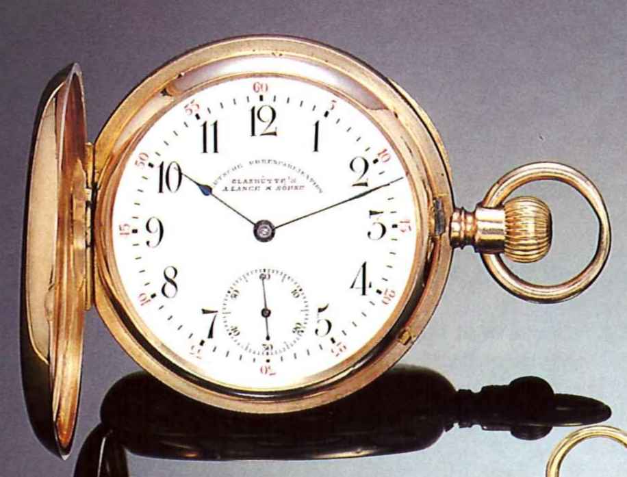 C. Three body, massive, "bassine", polished. Gold cuvette. D. White enamel with Arabic numerals, outer red Arabic minute ring and sunk subsidiary seconds. Blued steel "spade" hands. M. 18-, gilt brass, three quarter plate, 15 jewels, Glashütte gold straight fine lever escapement, cut bimetallic balance, Breguet balance spring. Signed on the dial and movement. In very good condition. Diam. 51 mm.