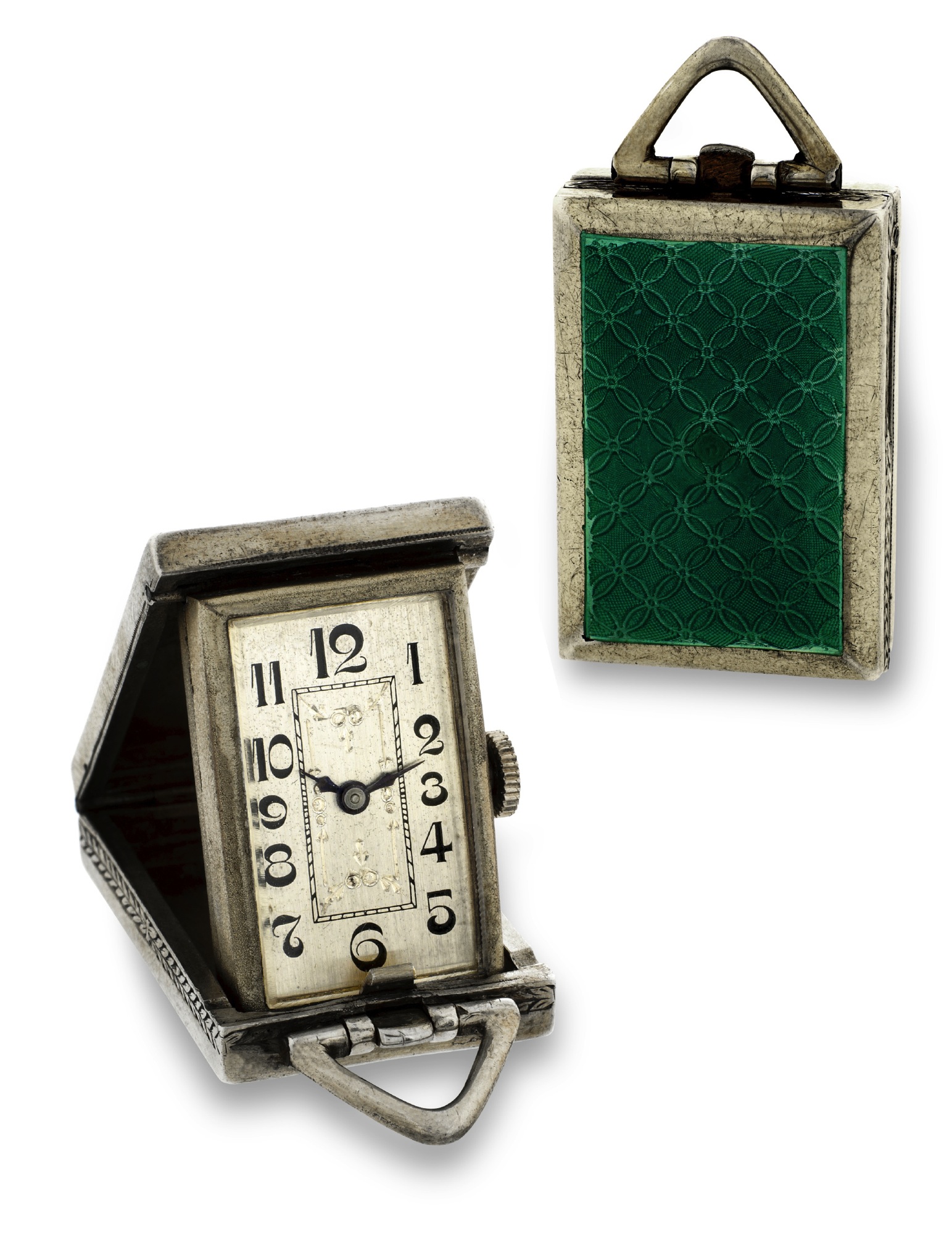 C. Four-body, solid, rectangular, walls silver with green enamel over guilloche, hinged rectangular inner case. D. Brushed silver with painted Arabic indexes. Blue steel cathedral hands. M. Rhodium-plated, fausses cotes decoration, 17 jewels, straight line lever escapement, monometallic balance, shock absorber, self-compensating flat balance spring. Case and movement signed. Dim 32 x 22 mm.