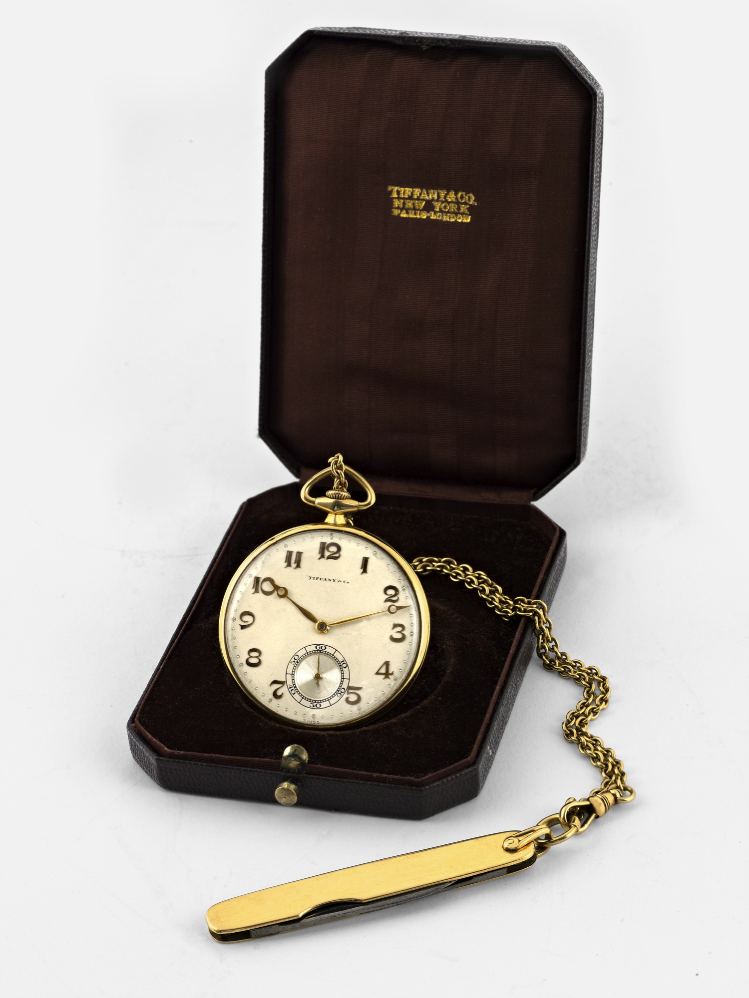 Internat ional Watc h Co. for Tiffany & Co. International Watch Co., Switzerland, No. 749646. Made for Tiffany & Co. circa 1930. Very fine 14K yellow gold keyless pocket watch. Accompanied by fitted box, chain and knife.