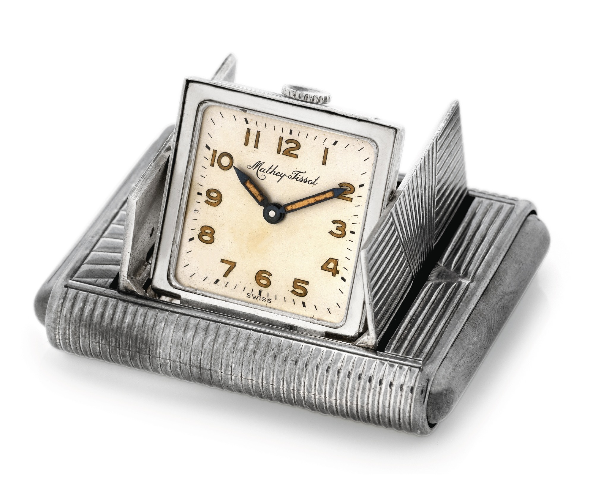 C. Rectangular with two panels that fl ip open by pressing the spring-loaded sides of the case to display the movement and the dial, engraved with an Art Deco design. D. Matte silver with Arabic numerals, outer minute track. Blued steel luminous baton hands. M. Rhodium plated, fausses cotes decoration, 17 jewels, straight-line lever escapement, bimetallic compensation balance, fl at balance spring, index regulator. Dial, case and movement signed. Dim. 44 x 34 mm