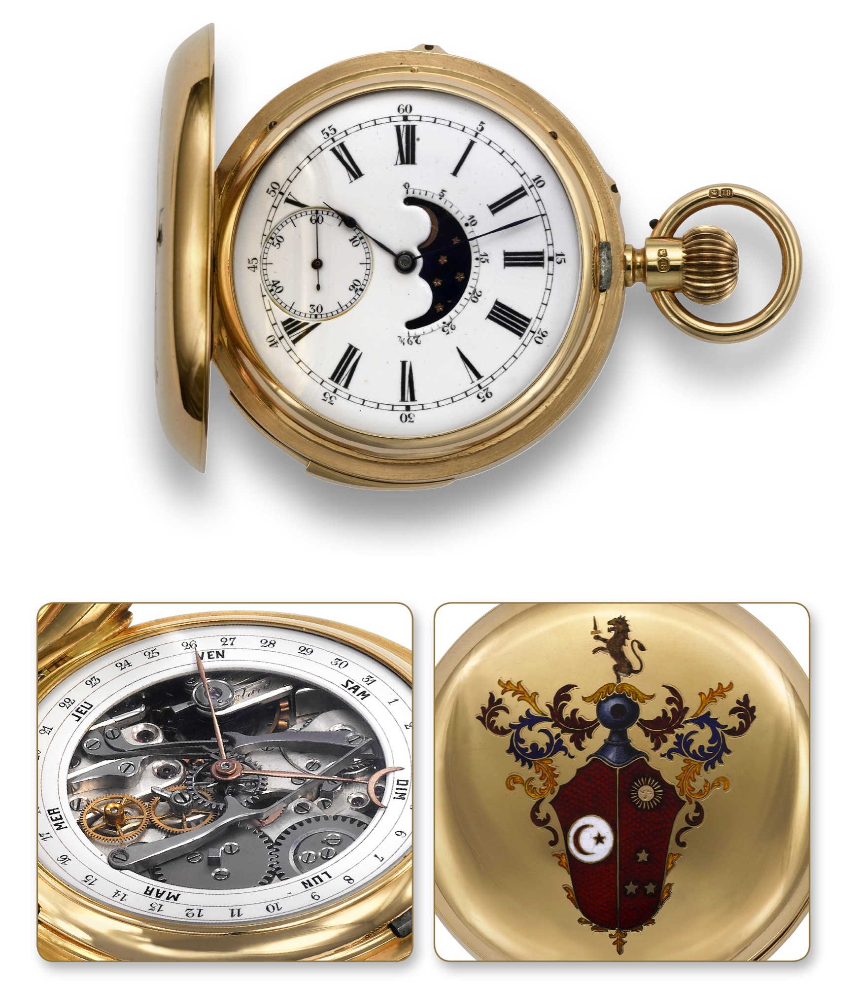 C. Three-body, bassine et fi lets, polished, the front cover with blue red and white enameled coat of arms, reverse cover with blue and red enameled monogram. D. White enamel on the front with radial Roman numerals, outer minute track and Arabic fi ve-minute numerals, subsidiary seconds at 9, large vertically lined inner moon phase aperture with lunar calendar on the edge. Blued steel spade hands. Annular white enamel rear dial with black Arabic chapter on the border for the dates, inner days of the week in French, the center exposing the movement. M. Nickel-plated, fausses cotes decoration, 18 jewels, raised barrel arbor, counterpoised straight-line lever escapement, cut and compensated bimetallic balance, blued steel Breguet overcoil balance spring, index regulator. Case numbered, hallmarked and stamped AB for London casemaker Arthur Baume. Diam. 54 mm, thickness 18 mm. Approx total weight 159g.