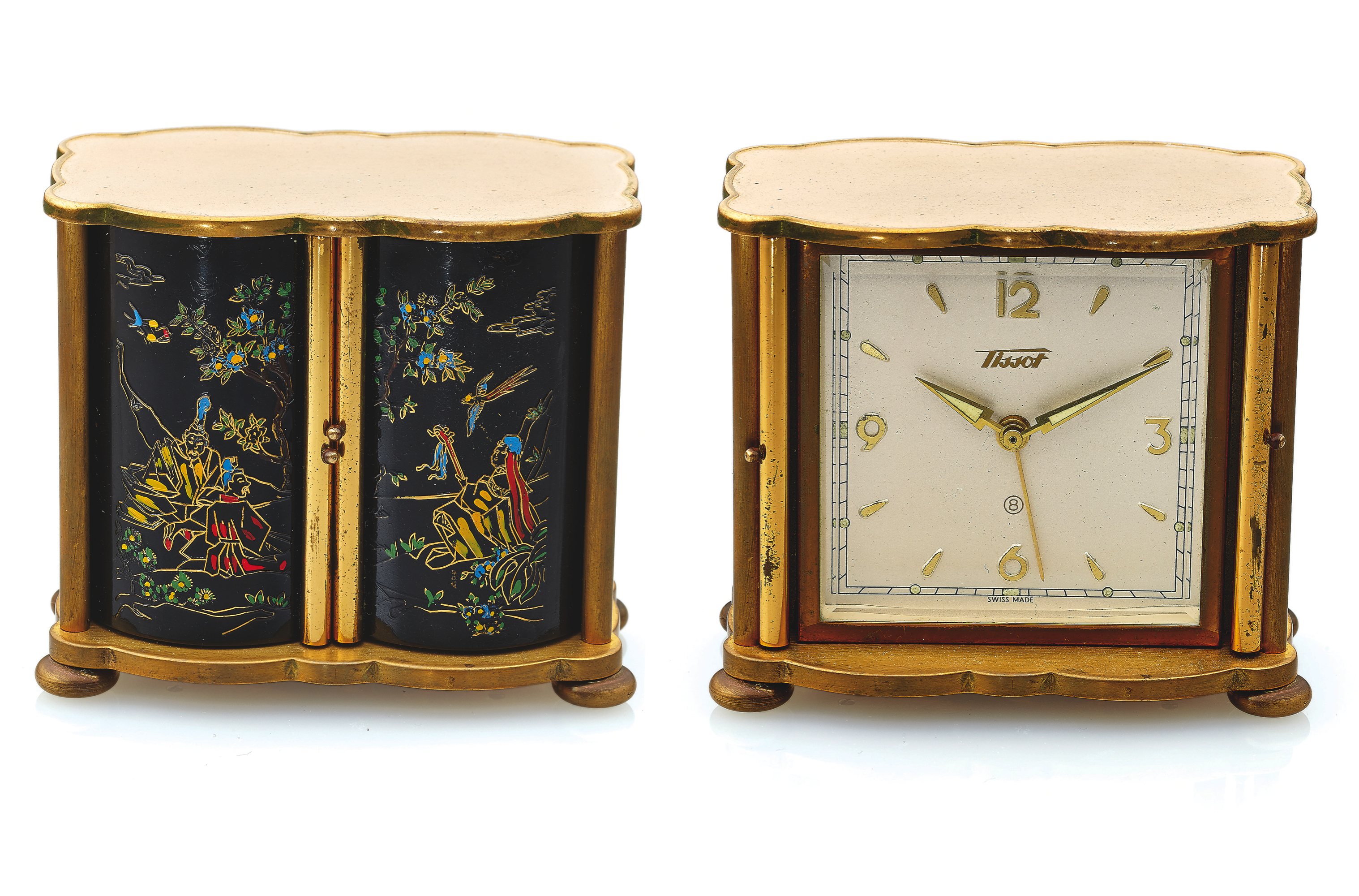 TISSOT CHINESE STYLE CABINET CLOCK BRASS & ENAMEL Tissot No. 949-1385, made circa 1950. Fine and unusual gilt brass, 8-day going alarm desk clock. To be sold without reserve