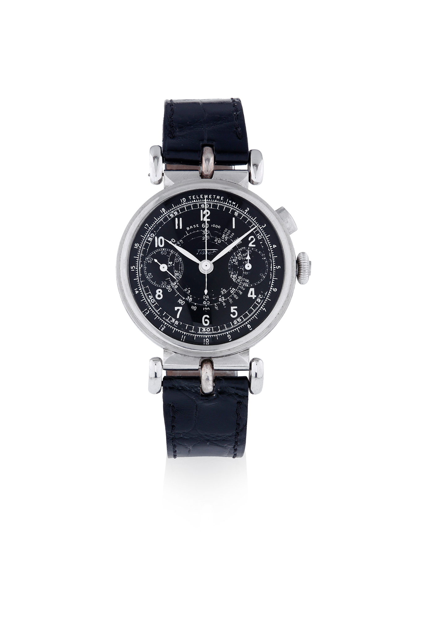 TISSOT, SINGLE-BUTTON CHRONOGRAPH, STEEL Tissot, chronograph, no. 834301. Made circa 1940. Fine, stainless steel, manual winding chronograph with flexible lugs. Belle et rare montre chronographe en acier. Boitier rond avec anses mobiles. Cadran noir avec chiffres arabes peints, totalisateurs pour les secondes et lesminutes, échelles tachymetrique et telemetrique. Aiguilles en acier. Mouvement mécanique manuel. Bracelet cuir. Cadran, boitier et mouvement signes. DIM. 37 mm.