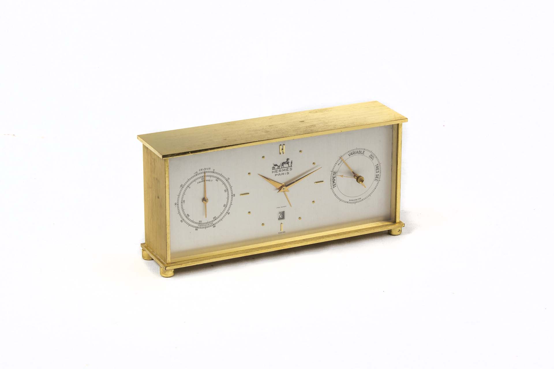 HERMES Pendulette de bureau 1970`s Pendulette de bureau incluant thermomètre et baromètre, mouvement mécanique 8 jours, caisse en laiton doré. Gilt manual winding desk clock combinated with barometer and thermometer manual Dimension 18 x 4 x 8,5 cm.