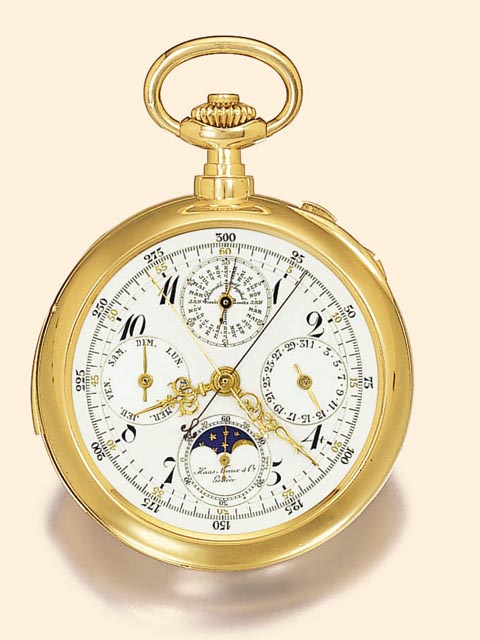 Haas Neveux & Co, Genève,No. 19287, circa 1890.Very fine and interesting small 18K gold keyless triple-complicated astronomical perpetual calendar watch with phases of the moon, split-seconds chronograph with 30-minute register, and minute-repeating.