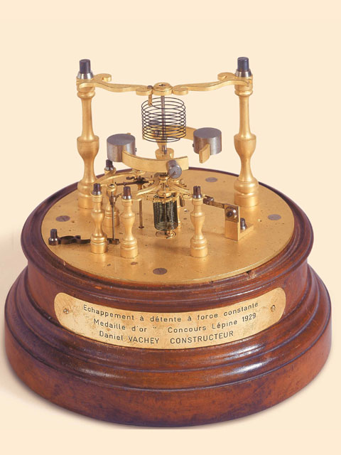 Daniel Vachey, Paris, circa 1928. Very fine model of an interesting unidirectional constant force escapement presented to the 1929 Lépine Concours where it won the Gold Medal. Circular, 167 mm, frosted gilt, large going barrel, three-wheel train, based on a spring detent escapement with blued-steel helical balance spring and Earnshaw type compensation balance. The constant force is delivered from a small helical spring mounted on the escape wheel arbor and colleted to a plate set on the third wheel arbor concentric with the escape wheel. When impulse is delivered during the short drop, the escape wheel unlocks a small locking lever which, in turn, releases a fly fixed to the last train pinion, which consequently releases the train, which winds the escape wheel helical spring. Round wooden base, glass dome (repaired). Signed on the base. Dim. Height with the dome 25 cm, base diam. 22 cm. Good condition.