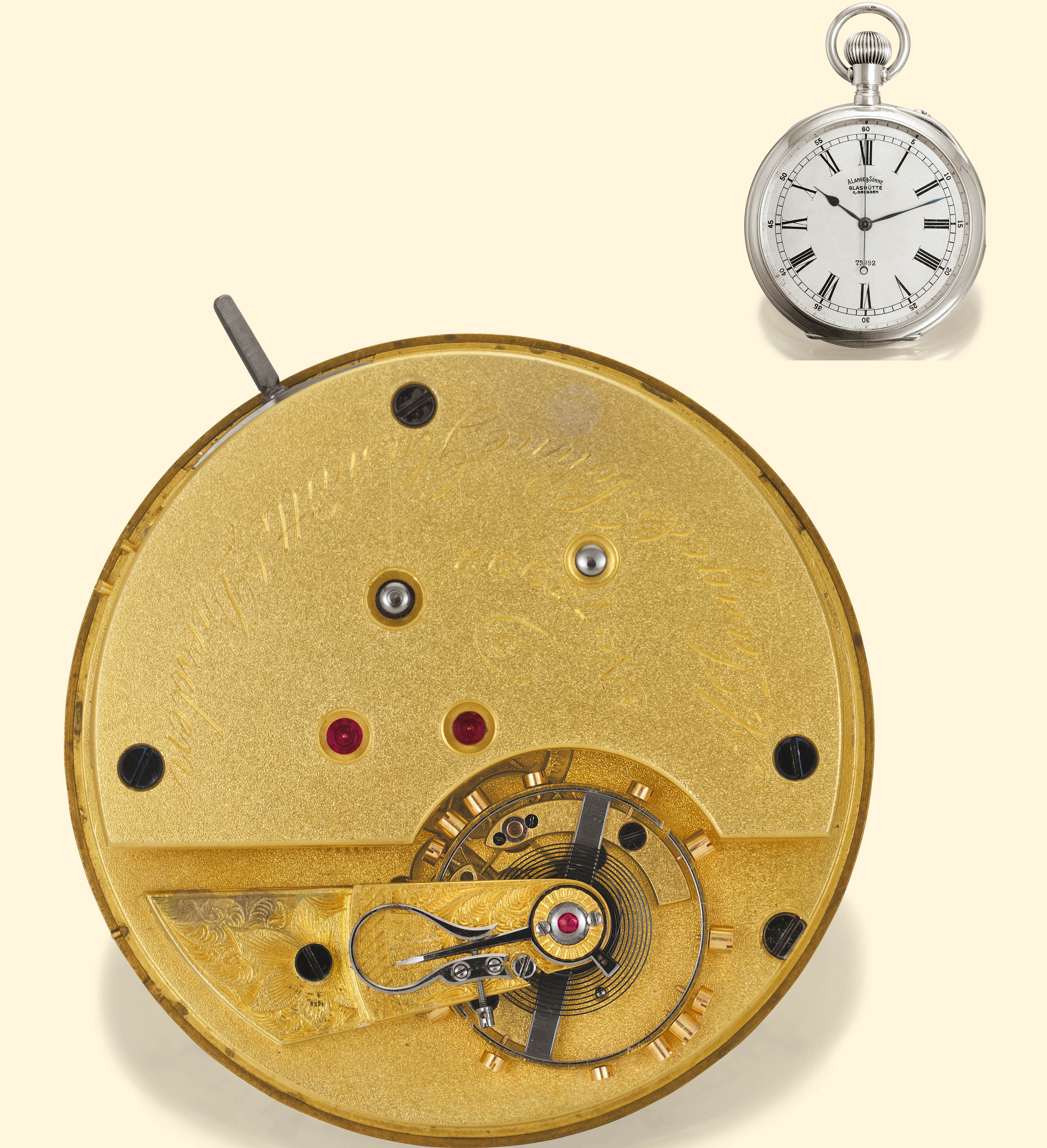 A. Lange & Söhne, Glashütte b/Dresden, No. 73992, made in 1915 for the Imperial Austrian Hydrographic Service in Pola. Exceptionally fine and rare silver, ALS quality, half-sec- onds, keyless pocket chronometer with pivoted detent escapement which obtained a Rating Certificate from the Deutsche Seewarte Hamburg.