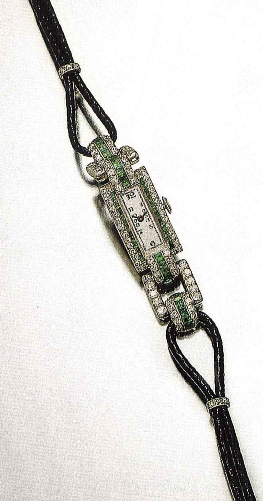 Leon Hatot, Paris, 1920's. Very fine Art Deco, rectangular, platinum, diamonds and emeralds lady's wristwatch with cord bracelet.
