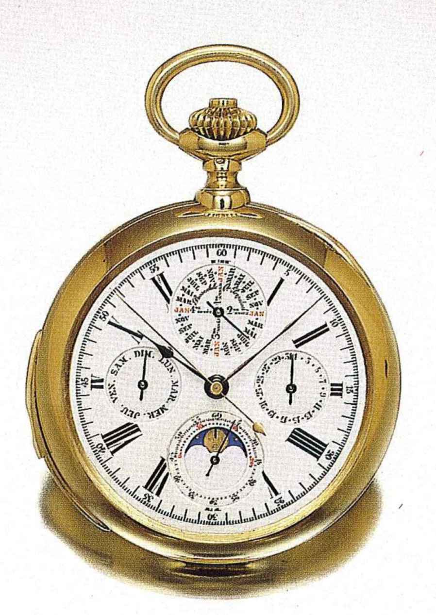 C. Four body, massive, "demi-bassine ", polished. Hinged gold cuvette. D. White enamel with Roman numerals, outer minute and chronograph ring, subsidiary dials for clays of the week, months of the leap year cycle, the date and seconds with inner moon phase aperture (slightly restored). Blued steel "spade" hands. M. 19"', gilt brass, Lemania ebauche 29 jewels, counterpoised straight line lever escapement, cut bimetallic balance, Breguet balance spring. Repeating on gongs with slide in the band. Chronograph with visible work and button on the winding crown. A. Nicolet signature scratched on the reverse of the dial. In very good condition. Diam. 54 mm.