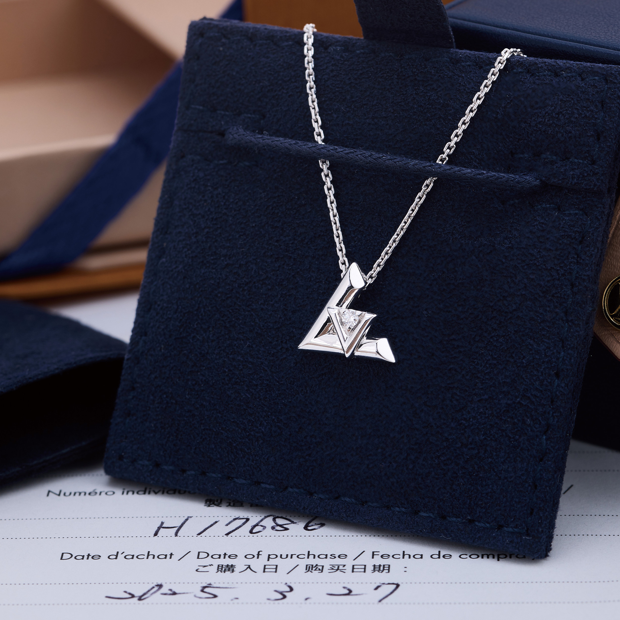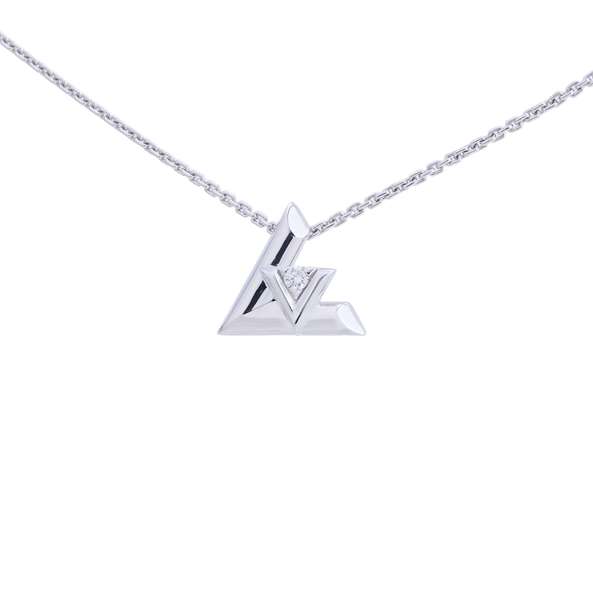 A Fine and elegant Louis Vuitton signed and numbered 18K white gold necklace with ‘LV’ diamond pendant.