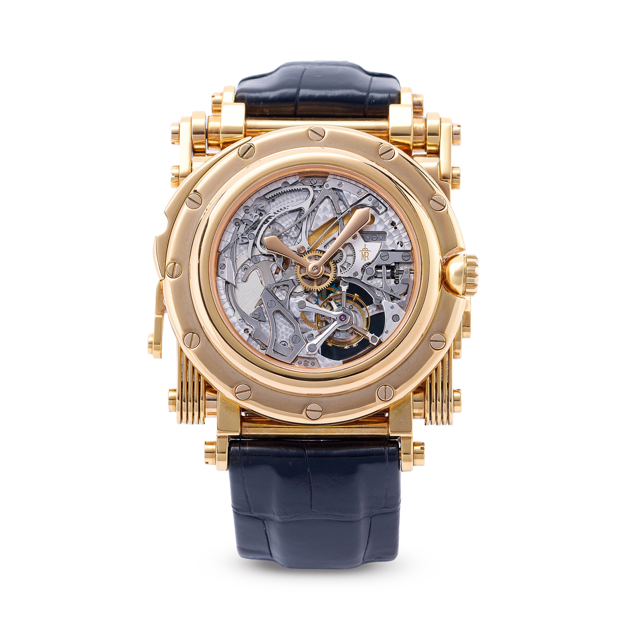 An impressive, massive, piece unique, openworked, manual winding tourbillon wristwatch with unique minute repeater mechanism inspired by Sydney Opera. The minute repeater slides at 10 o’clock House’s acoustics with fold-out bellows-type case made in 18K yellow gold set with diamonds case construction, the transparent case back reveals the mesmerizing movement. To press and hold the deployment lock at 9 o'clock on the bezel and then open the case by grasping it from above and gently pulling it, while the resonant chamber amplifies the repeater’s melodious chimes.