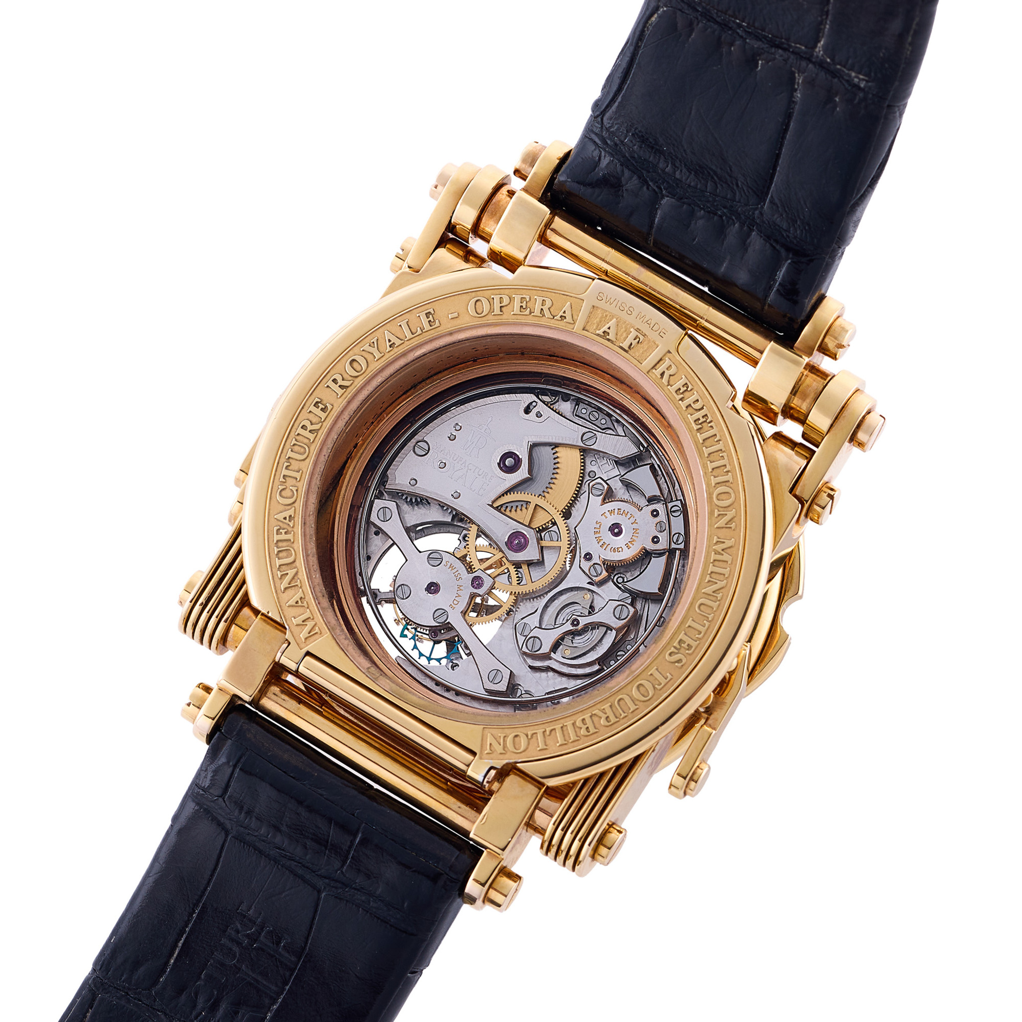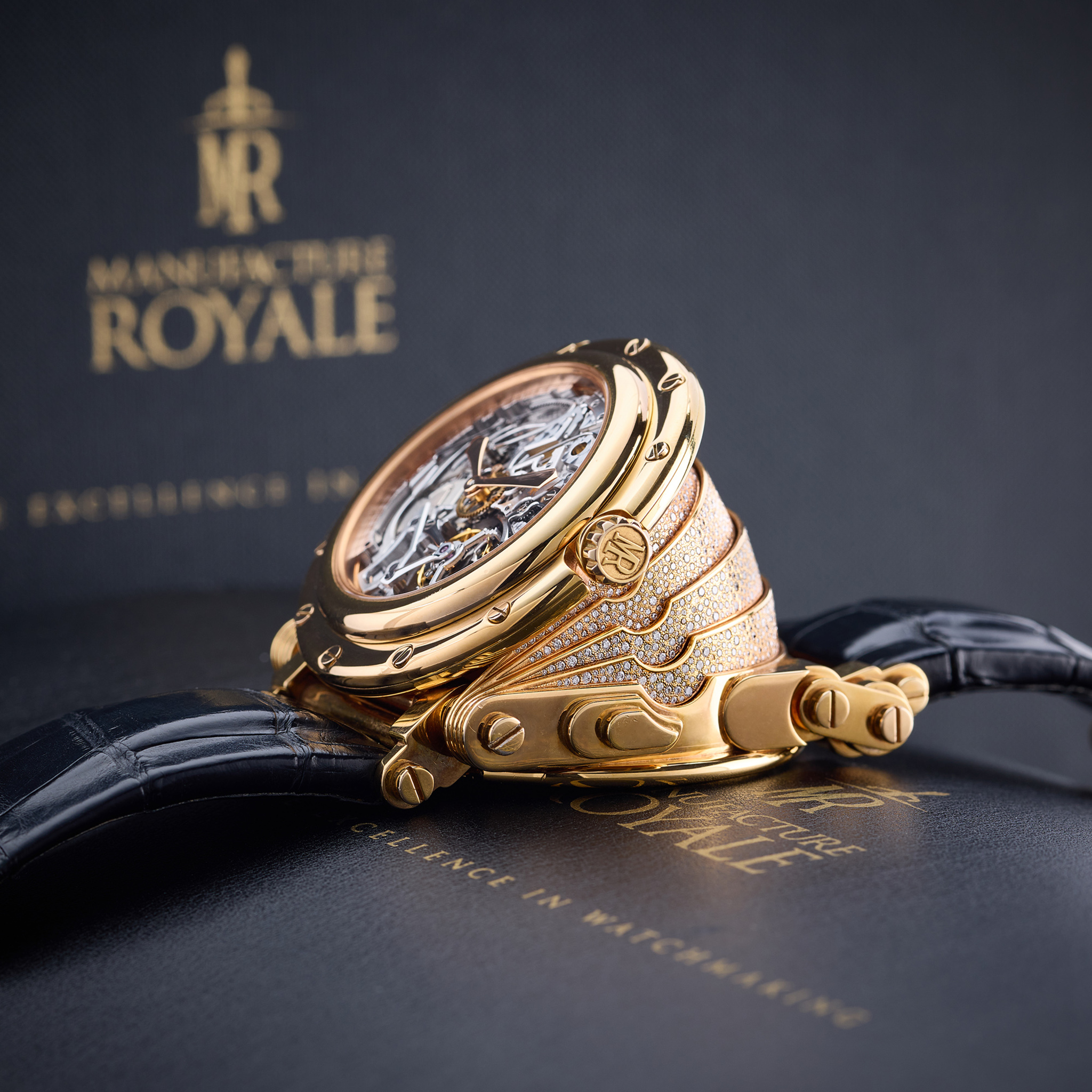 Revolutionary Innovation & Design:The “Opera’s” defining achievement is its internal resonant chamber architecture housed within a revolutionary fold-out bellows-type case made of 18K yellow gold and set with diamonds. Unlike traditional minute repeaters, Manufacture Royale engineers designed an innovative acoustic chamber that amplifies and enriches the chiming tones, mirroring the Opera House’s sound projection principles. This required three years of development to optimize the internal geometry and gong positioning for superior acoustic performance within the constraints of a wearable timepiece.