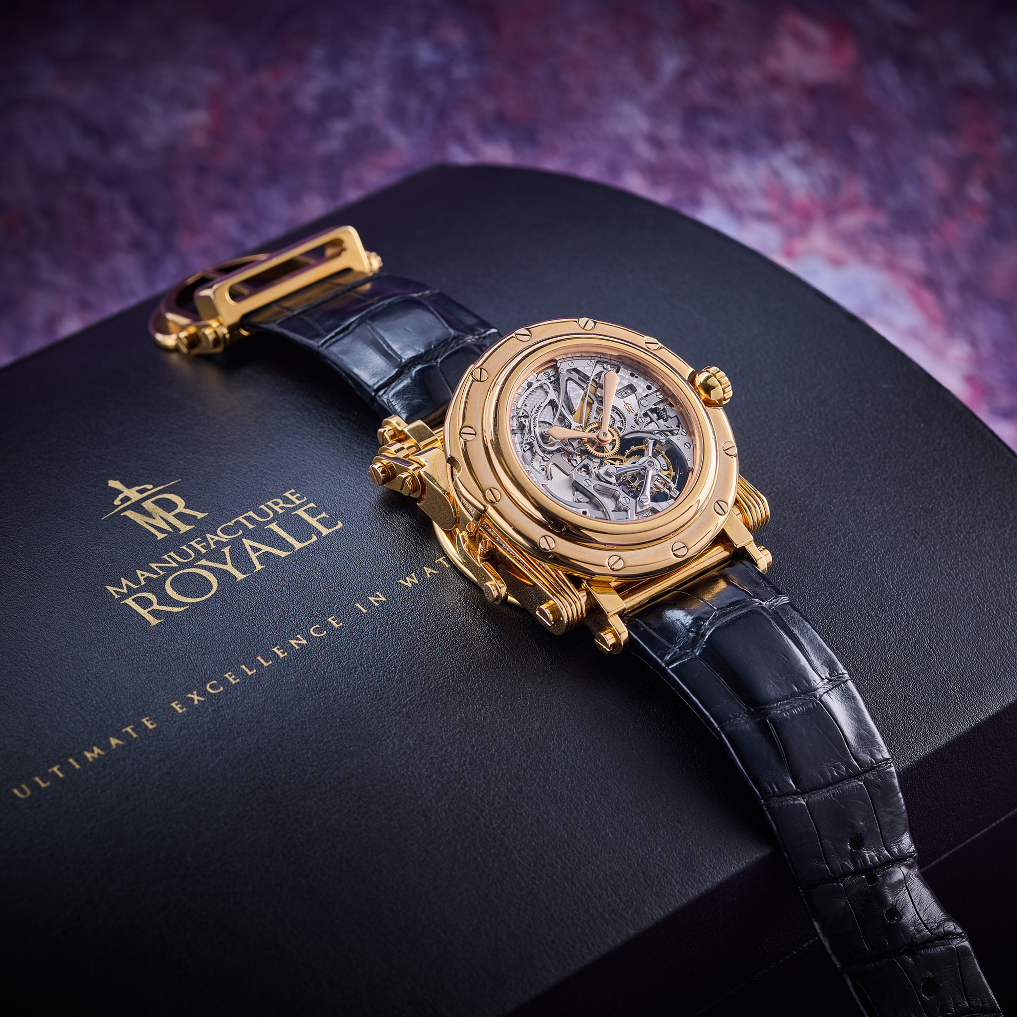 Complete with original box, papers, and Manufacture Royale certification, this UNIQUE collection timepiece exemplifies contemporary horological innovation in combining artistic design with mechanical mastery.