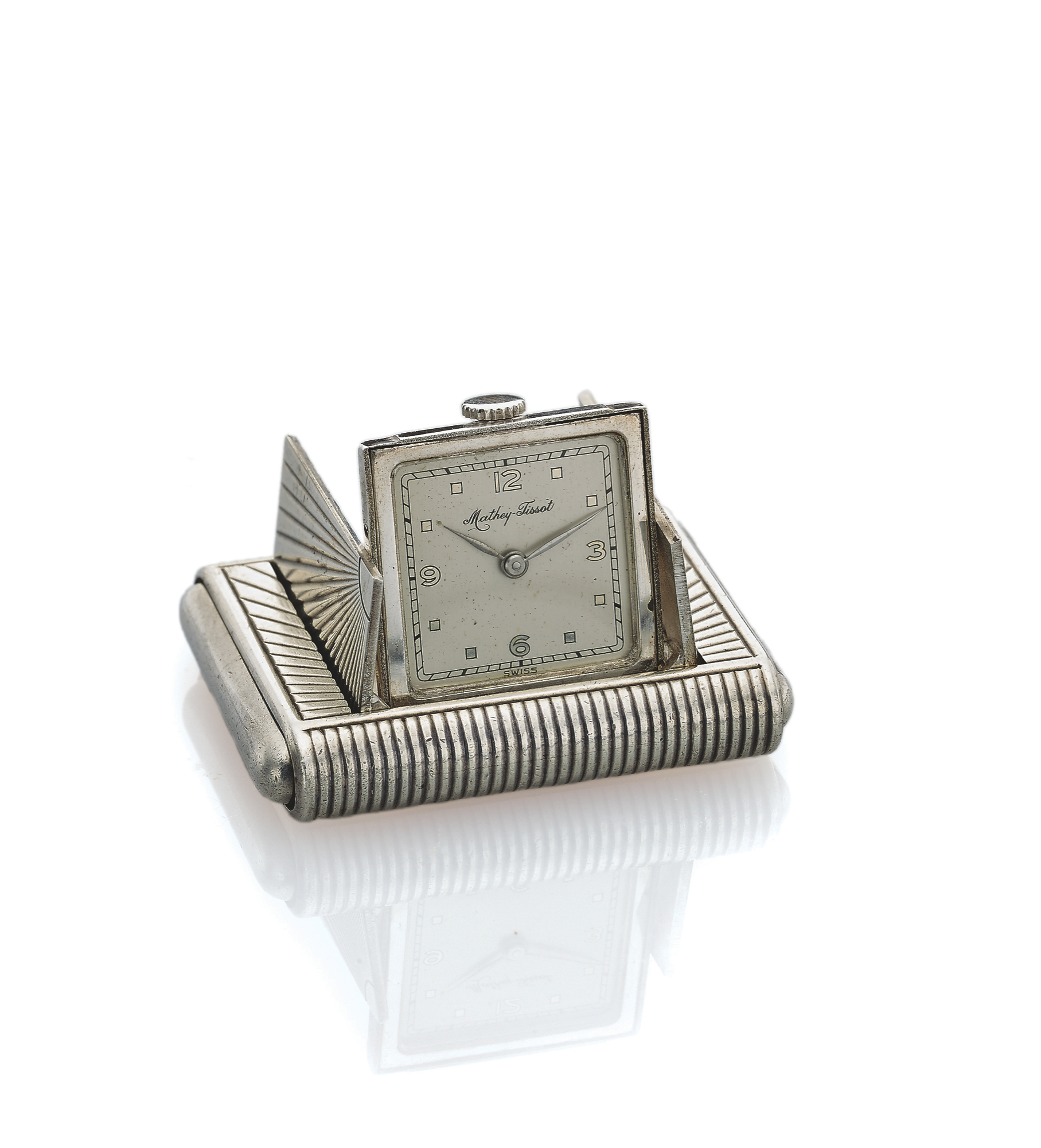 MATHEY-TISSOT PURSE WATCH STERLING SILVER Mathey-Tissot, Swiss, No. 12745. Made in the 1920s. Fine and rare, sterling silver purse / desk watch with concealed shuttered dial.