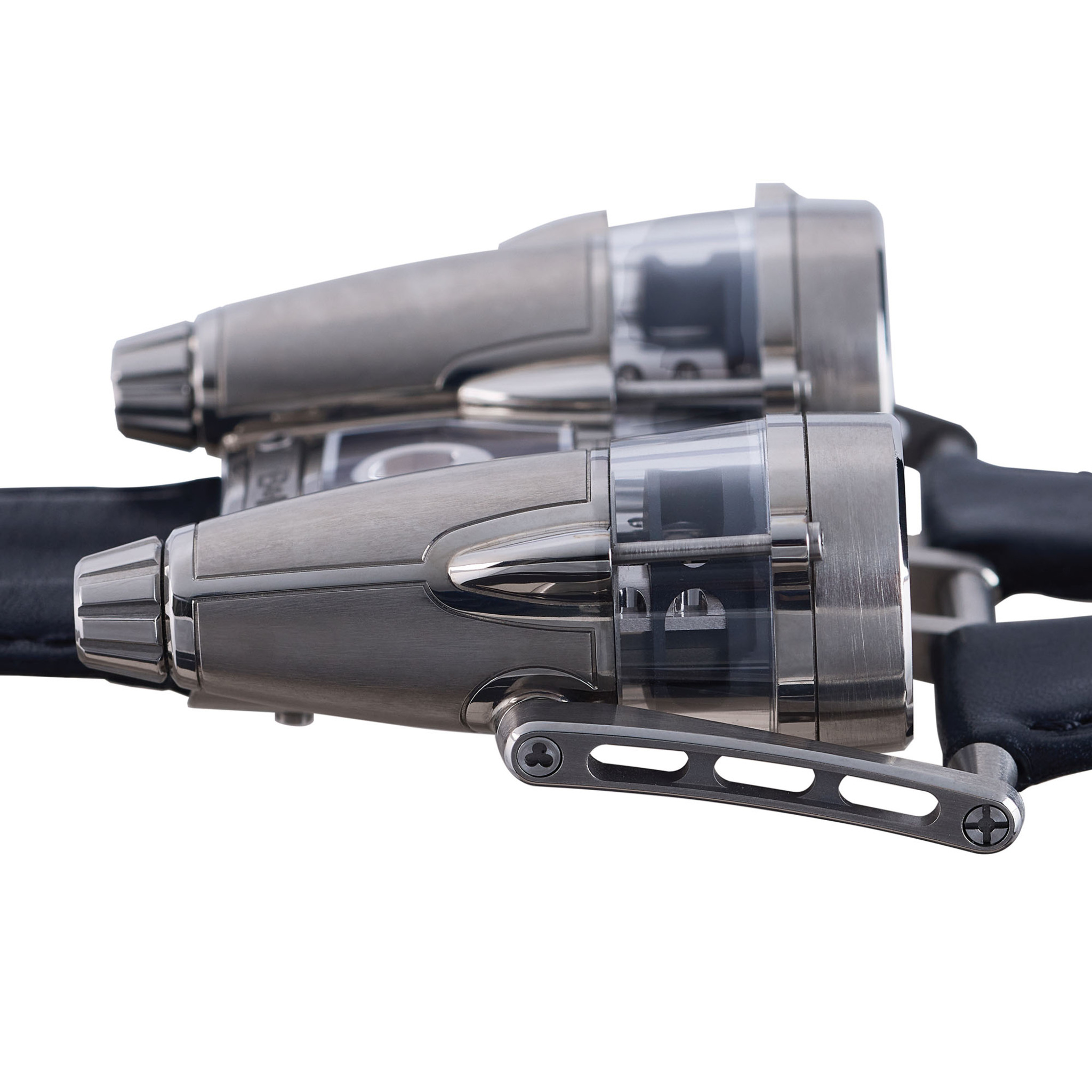 The MB&F HM4 «Thunderbolt» is a landmark timepiece that stretches the boundaries of watchmaking. Its architecture, directly inspired by the fuselage of a A-10 fighter plane, is as radical as the engine within. The HM4 features a manually wound movement developed over three years. This dedicated caliber, comprising 311 components all conceived specifically for this watch, was entirely designed by MB&F in collaboration with master watchmakers Laurent Bisse and Béranger Reynard of Les Artisans Horlogers.