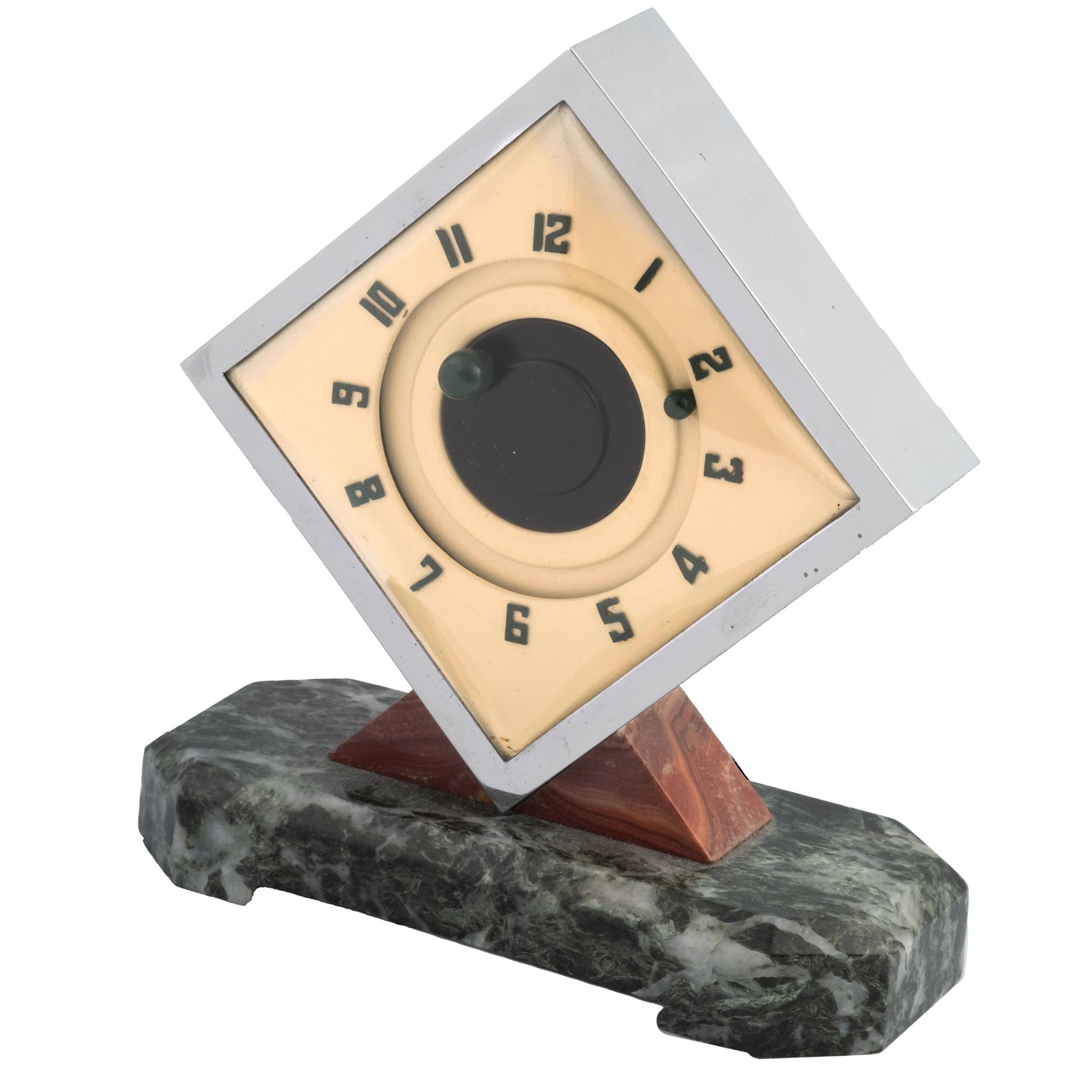A beautiful, very rare, chrome and marble, manual wind Art Deco desk clock with wandering hours and minutes