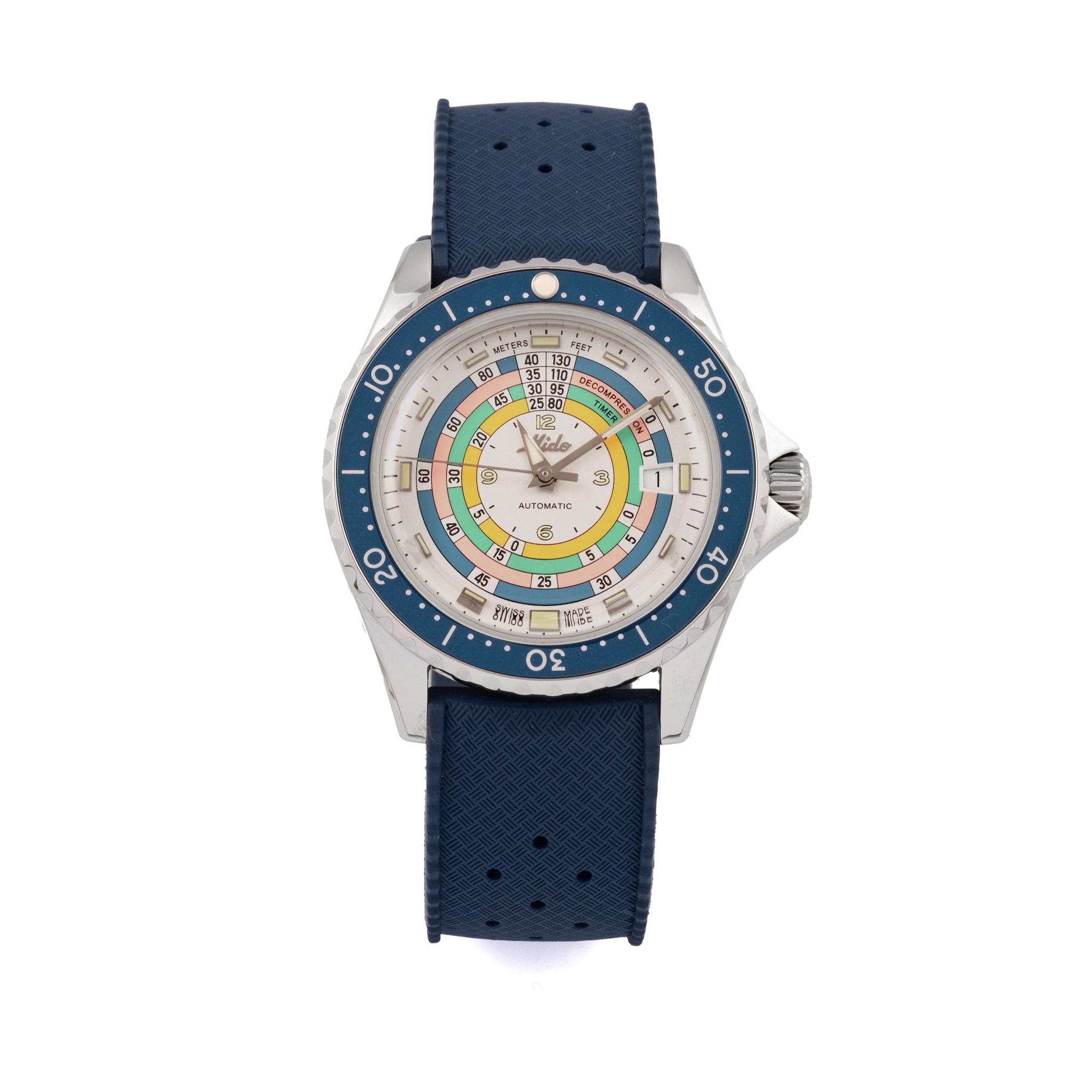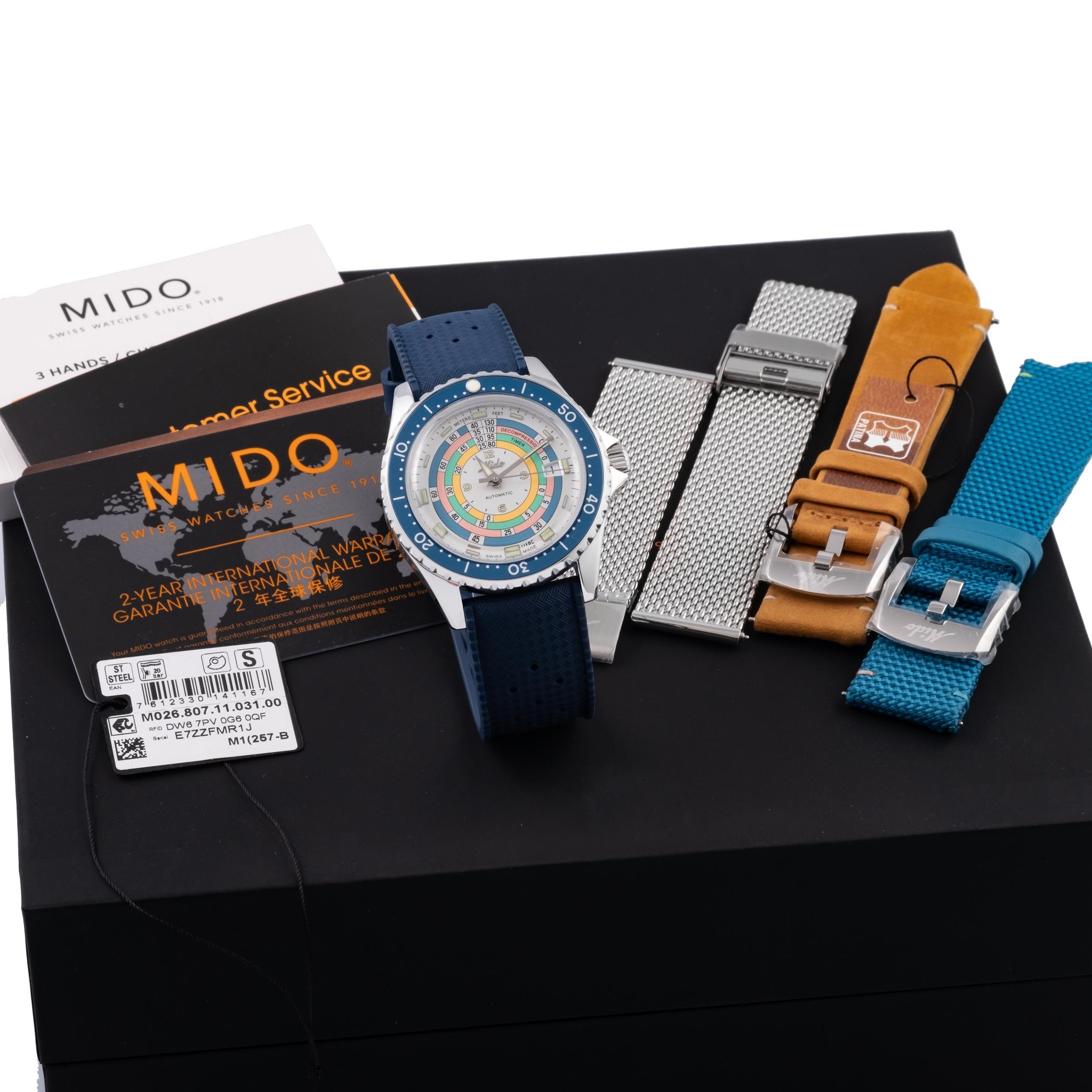 A very fine and large, stainless steel, self winding diver’s, 200m water-resistant wristwatch, screw-down crown and caseback, unidirectional bezel, 60-minute scale on turquoise aluminium insert with luminous pearl, silvered white with polished applied indexes with neutral Super-LumiNova - decompression scale represented by 4 concentric coloured circles (yellow, green, pink and blue). Polished applied original Mido logo - flat diamond-cut hour and minute hands with neutral Super-LumiNova - date window at 3 o'clock.