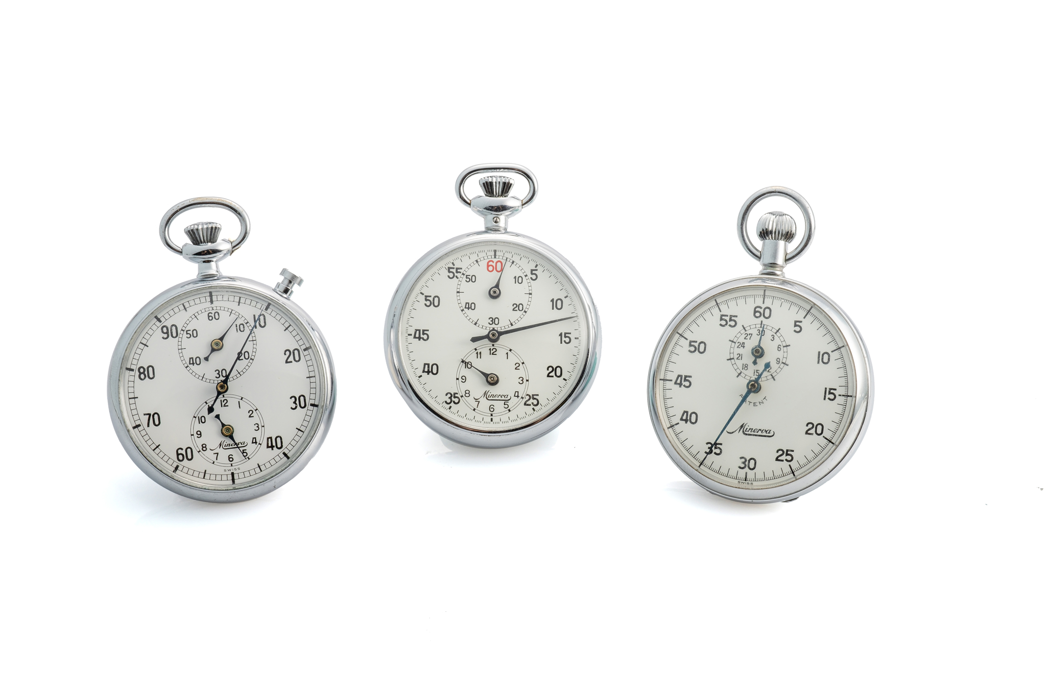 MINERVA, 3 CHRONOGRAPH POCKET WATCHES, BASE METAL
