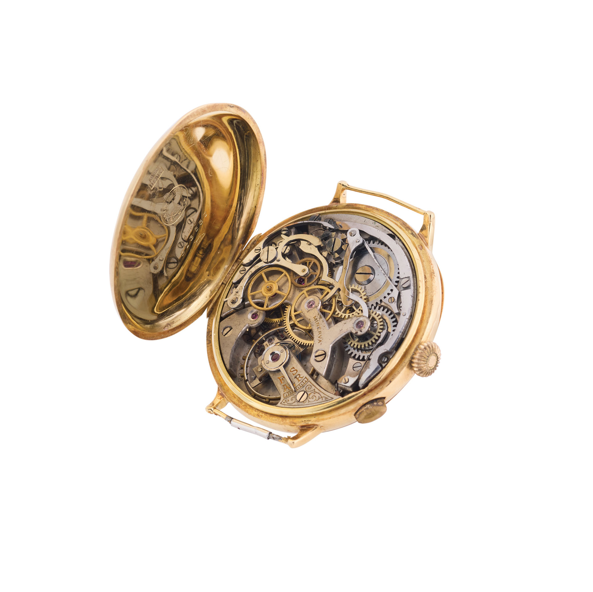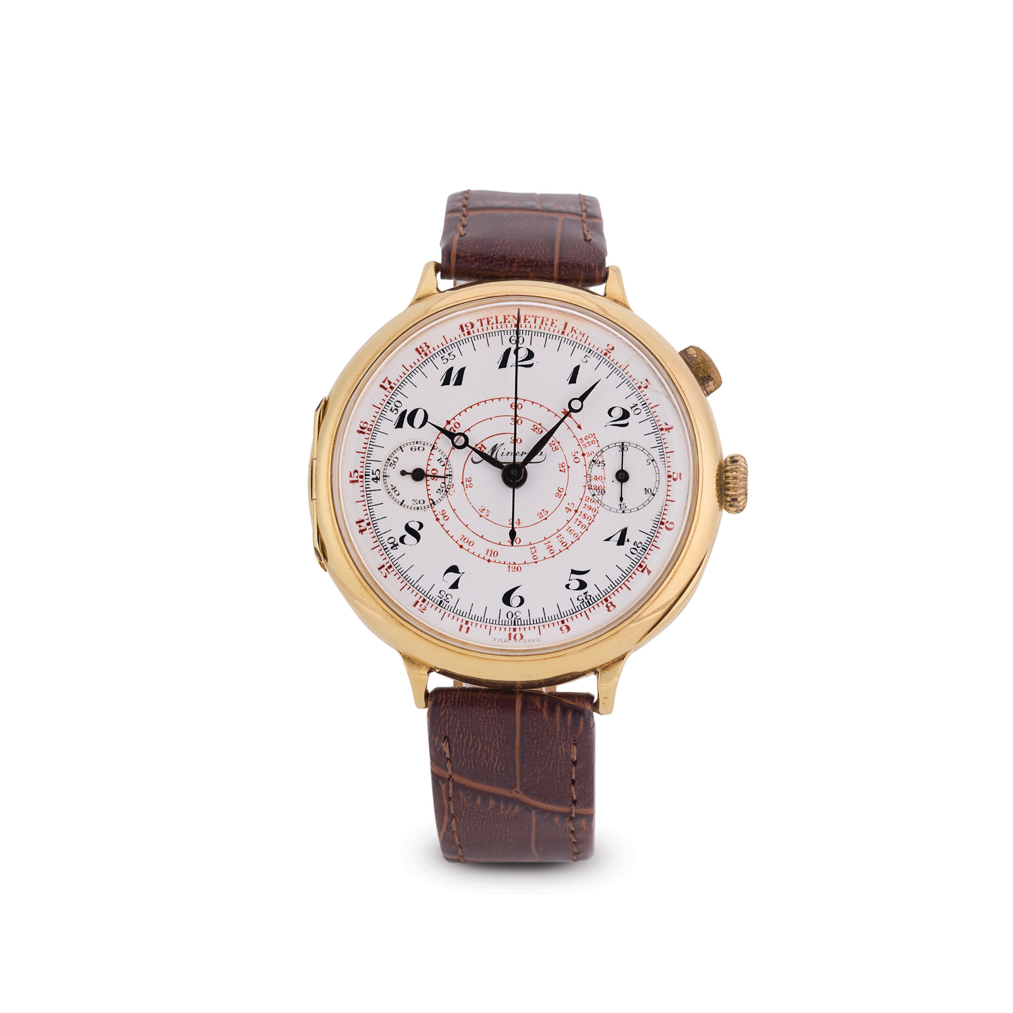 A fine, 18K yellow gold, early large single-button chronograph with minute counter and inner scale graduated in an Archimedean spiral.
