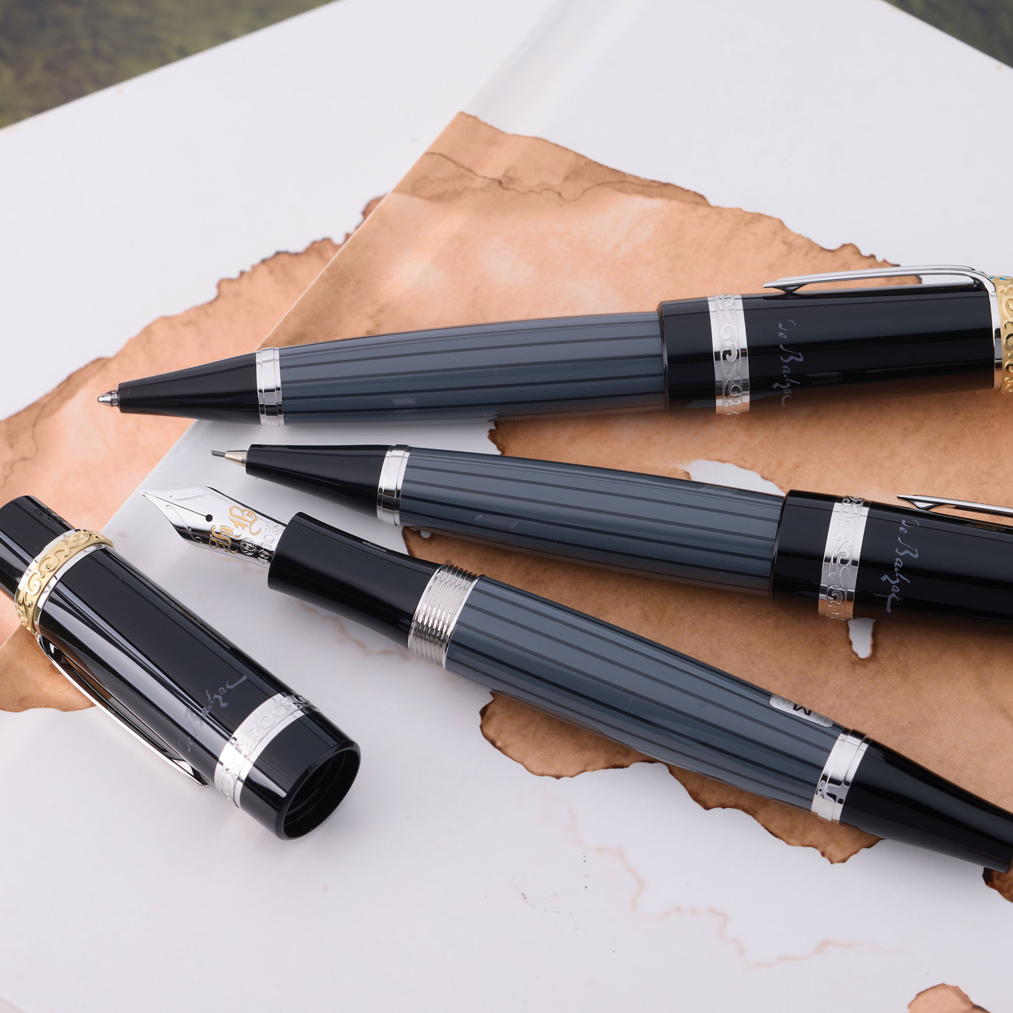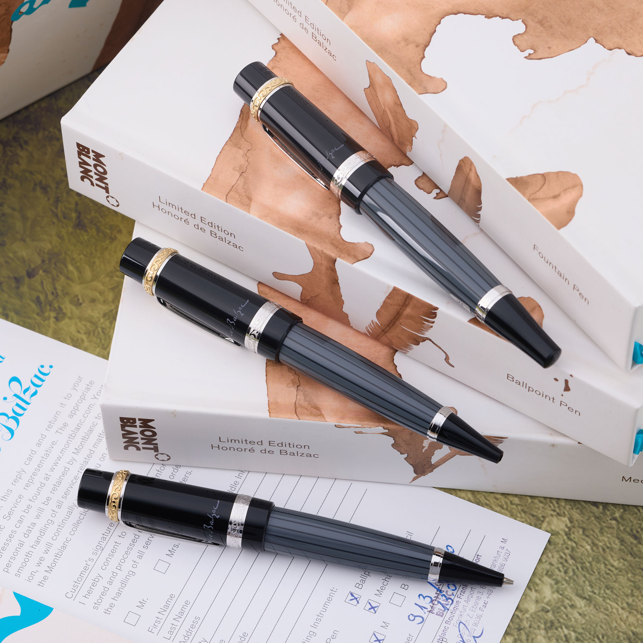 Montblanc, “Honoré de Balzac” Montblanc created this pen in 2013 in honour of Honoré de Balzac (1799-1850), in a limited edition. The pen’s design evokes the stature of the great man of letters, as well as his style of dress, always marked by dandyism and luxury. The cap is crafted from precious black resin and the barrel from dark grey lacquer with fine stripes are reminiscent of Balzac’s frock coat. The platinumplated clip ring with turquoise porcelain inlays is inspired by his sumptuous cane. Balzac, Honoré de May 20, 1799 – August 18, 1850 French novelist and playwright. The novel sequence La Comédie humaine, which presents a panorama of post-Napoleonic French life, is generally viewed as his magnum opus. Owing to his keen observation of detail and unfiltered representation of society, Balzac is regarded as one of the founders of realism in European literature. He is renowned for his multi-faceted characters; even his lesser characters are complex, morally ambiguous and fully human. Inanimate objects are imbued with character as well; the city of Paris, a backdrop for much of his writing, takes on many human qualities. His writing influenced many famous writers, including the novelists Emile Zola (1840-1902), Charles Dickens (1812-1870), Gustave Flaubert (1821-1880), and Henry James (1843-1916), filmmaker François Truffaut (1932-1984), and philosophers such as Friedrich Engels (1820-1895) and Karl Marx (1818-1883). Many of Balzac’s works have been made into films and continue to inspire other writers.