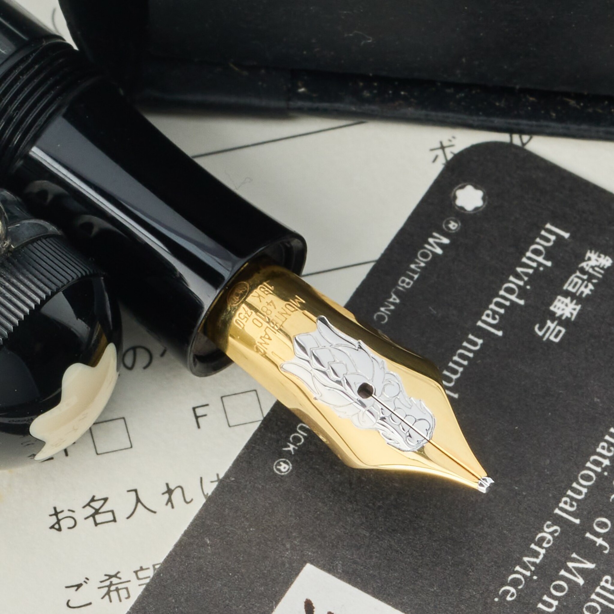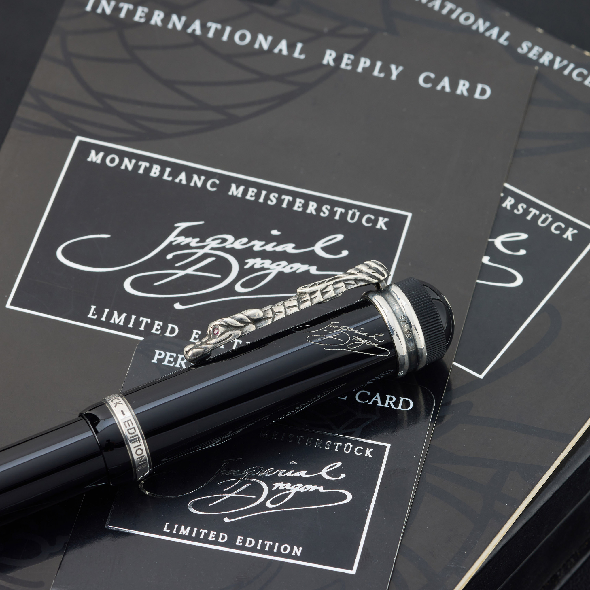 A fine and rare, limited edition fountain pen. Montblanc Imperial Meisterstück Dragon Asia Line: Limited to 5,000 pieces (1993). The barrel and cap are made by black resin with sterling silver fittings, dragon-shaped clip with ruby eyes, and 18K two-tone gold nib engraved with a dragon’s head. The cap features the “Imperial Dragon” signature and the Montblanc emblem inlaid on the cap top. Made for the Asian market only.