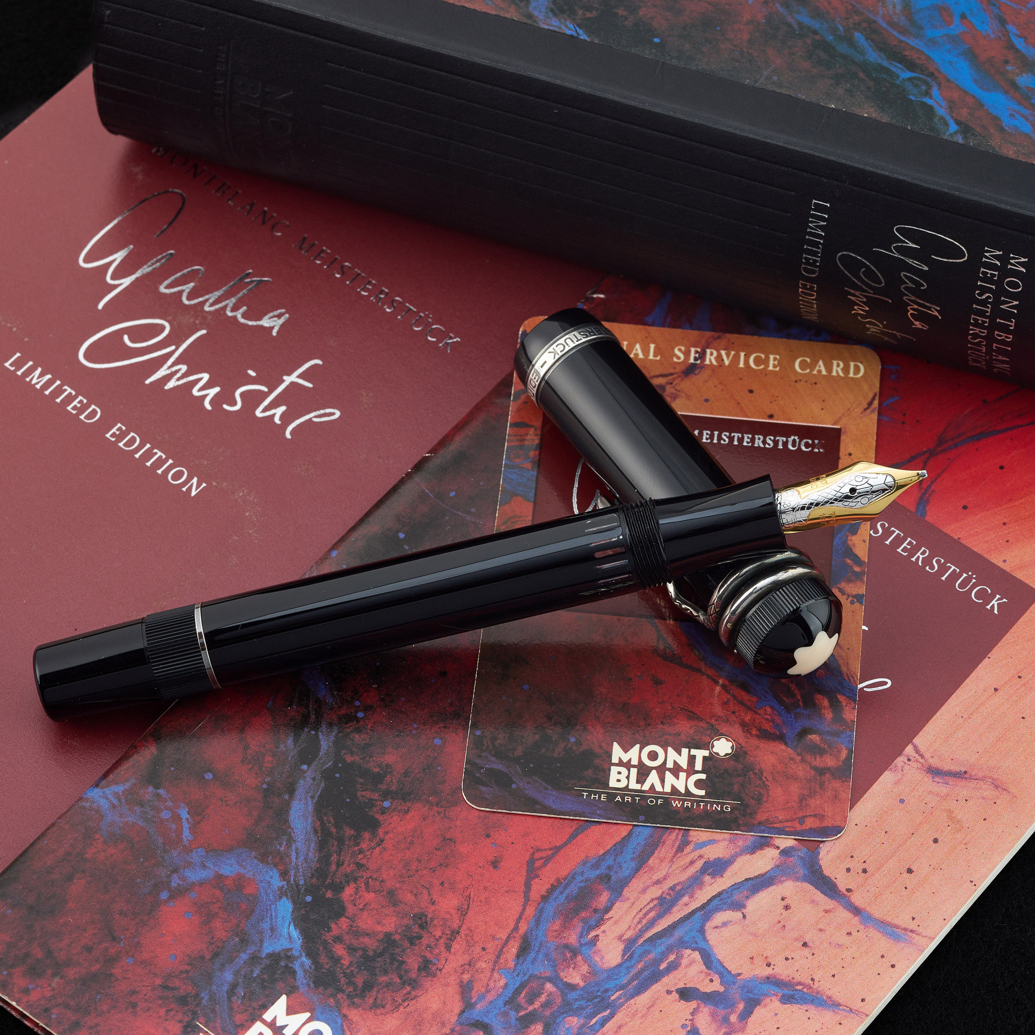 A very fine and rare fountain pen Montblanc Writers Edition Agatha Christie: Limited of 30,000 pieces. The pen's body is made by black resin, engraved with Agatha Christie’s signature, with a viper's pocket clip set with genuine ruby eyes, with medium 18K two-tone gold nib engraved with a viper head. The design is elegant yet dramatic, reflecting the tension and suspense of Agatha Christie's detective novels. One of Montblanc’s most sought-after limited edition pens.