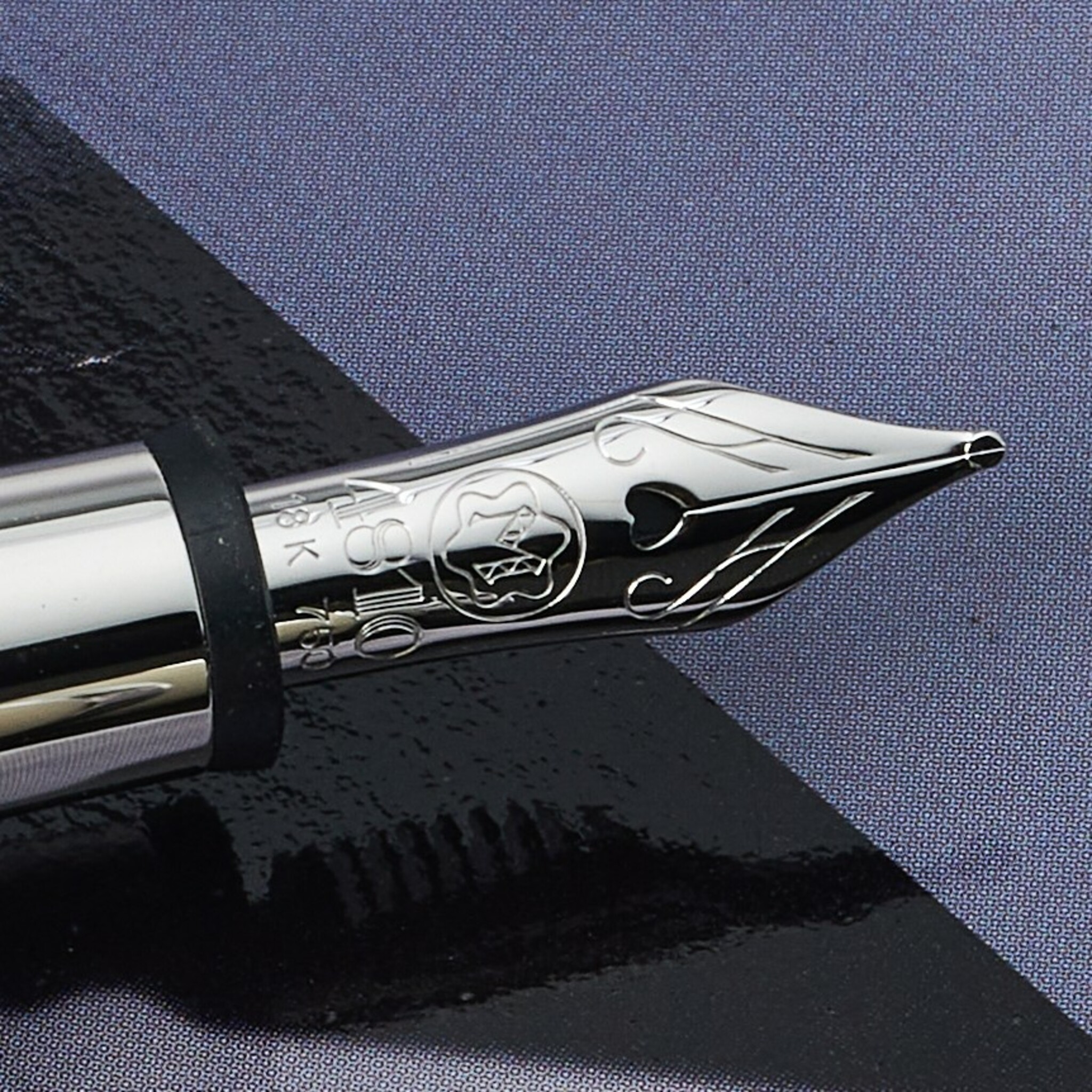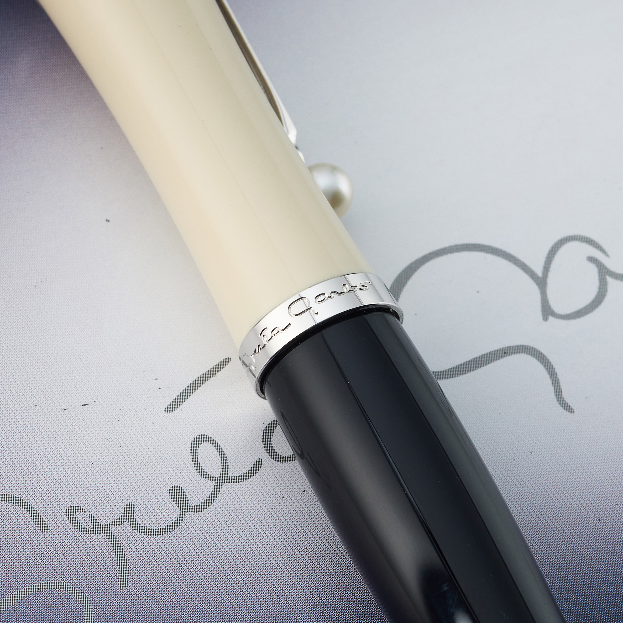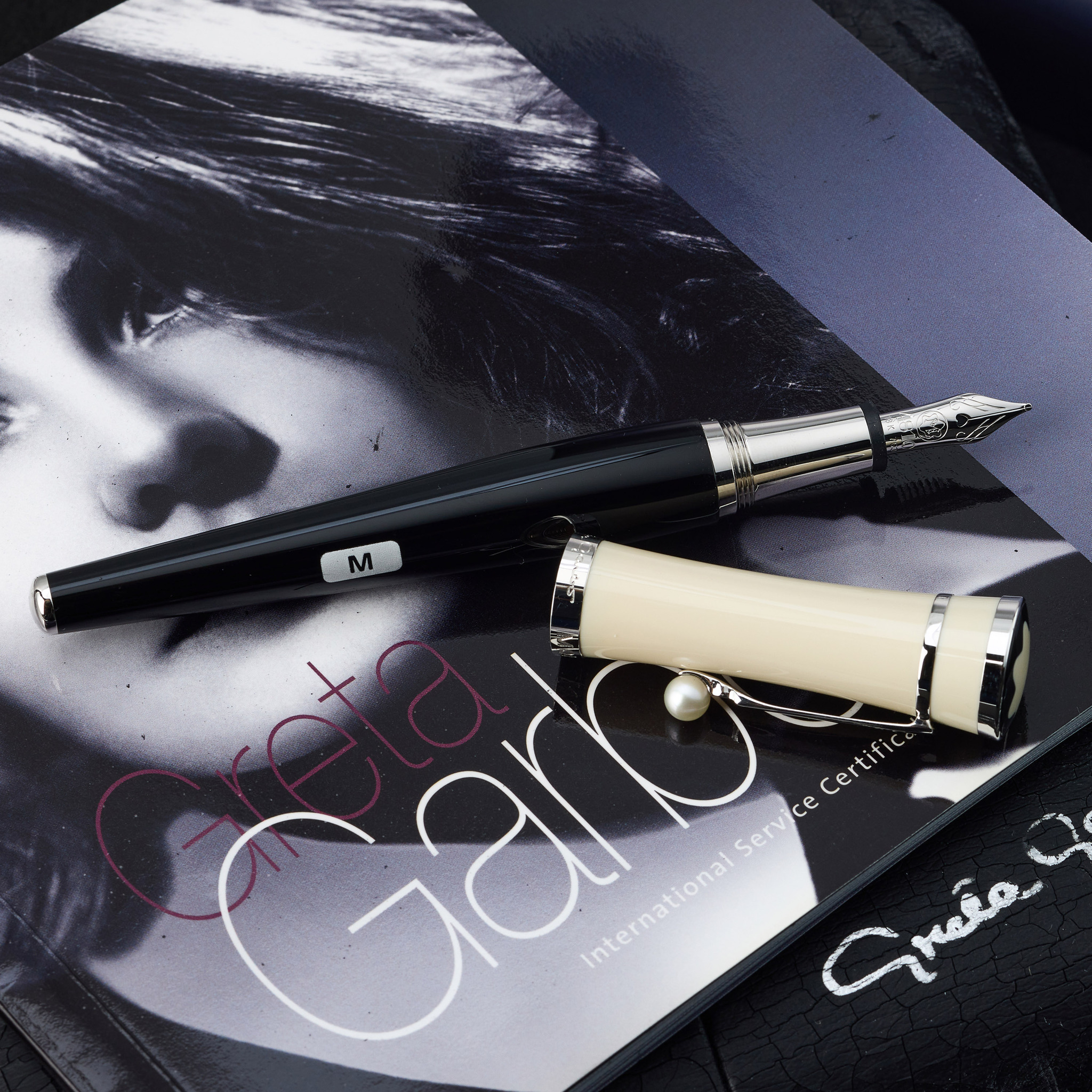 A fine and rare fountain pen. Montblanc Muse Edition: Greta Garbo (2005). The barrel is made by black resin and the cap is made of cream-colored resin with platinum fittings, a white Akoya pearl on the clip set, a 18K gold nib with a heart hole, and “Greta Garbo” signature embellished on the cap ring.