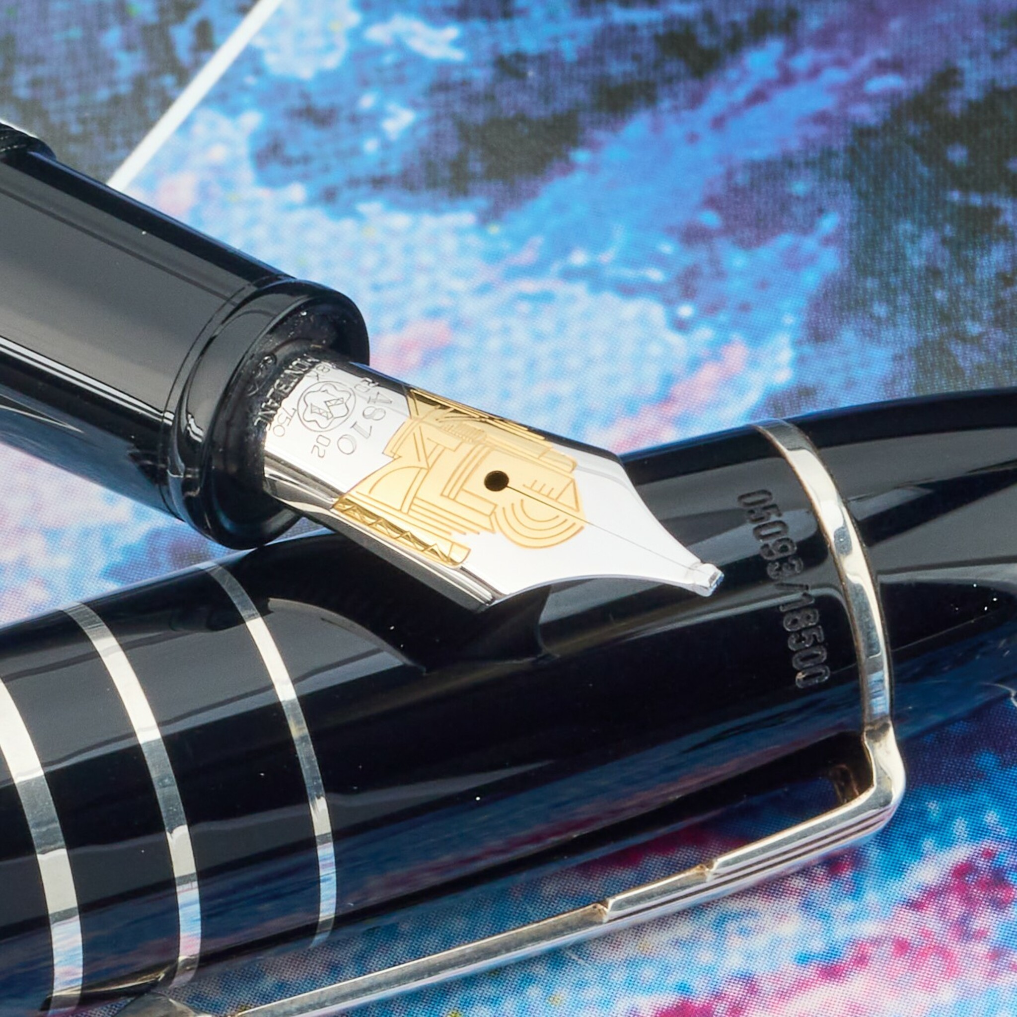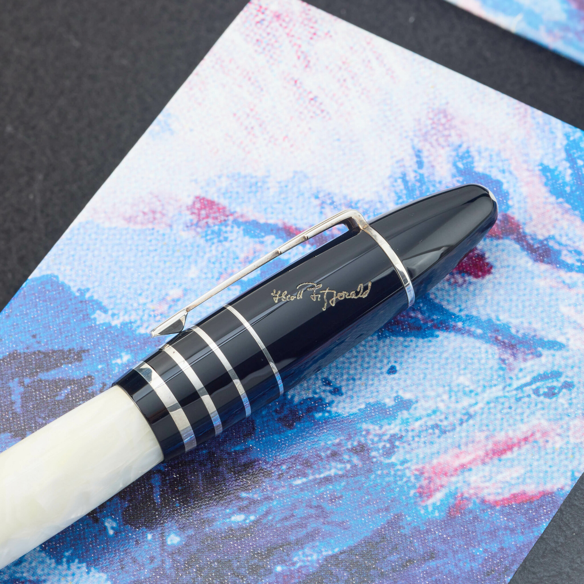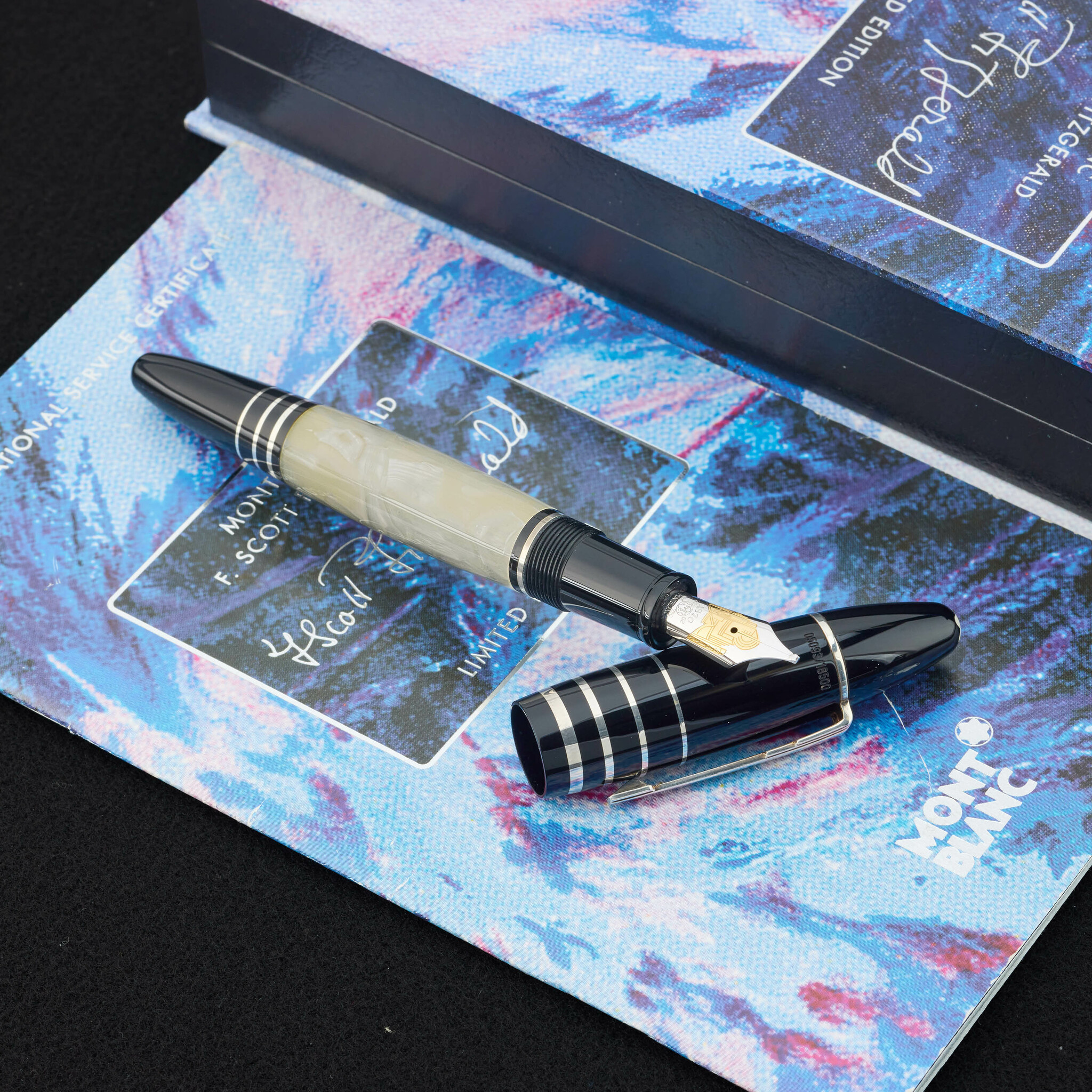 A fine, and rare, limited edition fountain pen. Montblanc Writers Edition F. Scott Fitzgerald: Limited to 18,500 pieces (2002). The barrel and cap are made of black and white marble resin, complemented by 925 sterling silver fittings and a clip. The 18K two-tone gold nib features an engraved Art Deco skyline motif from the 1920s, and the writer’s signature embellished on the cap.