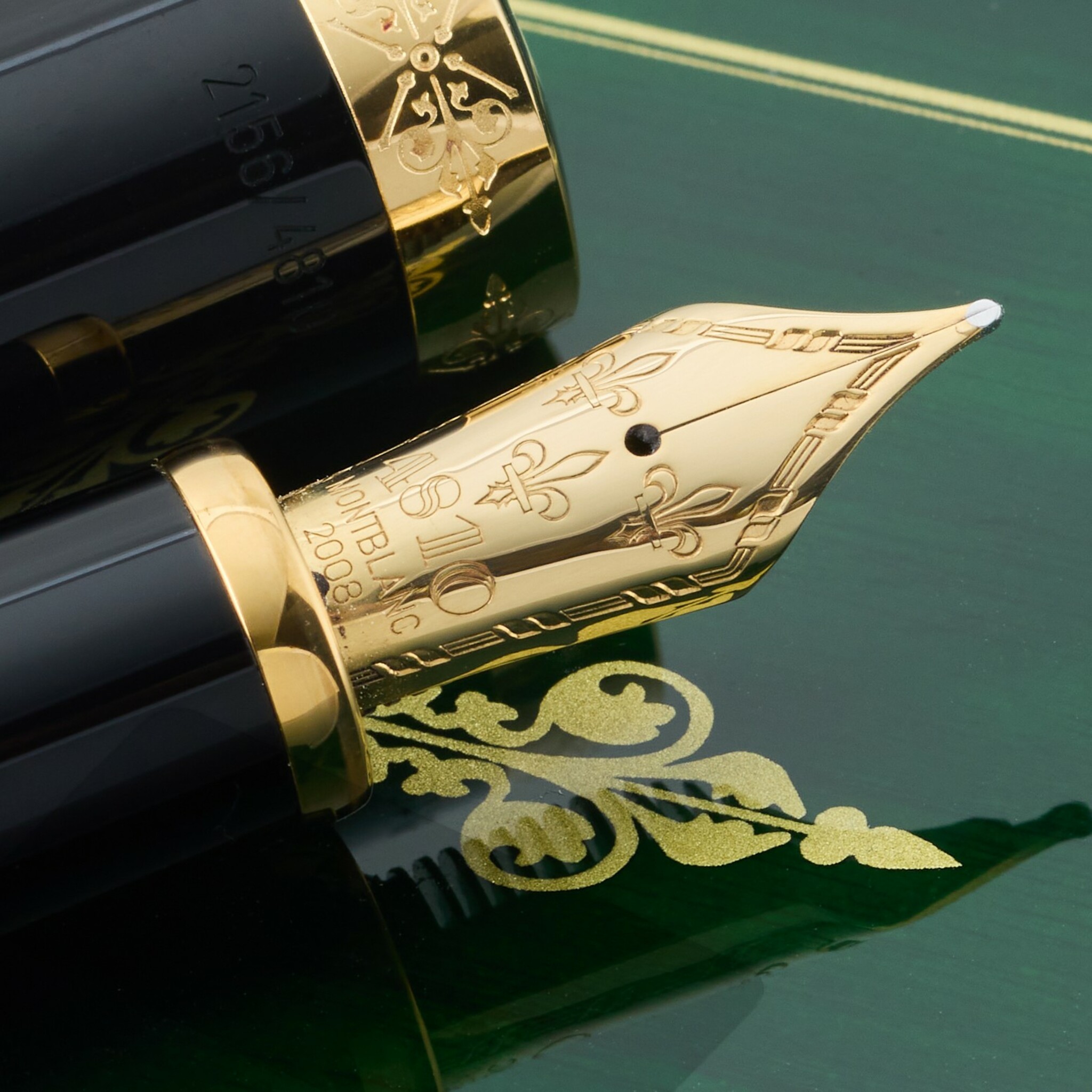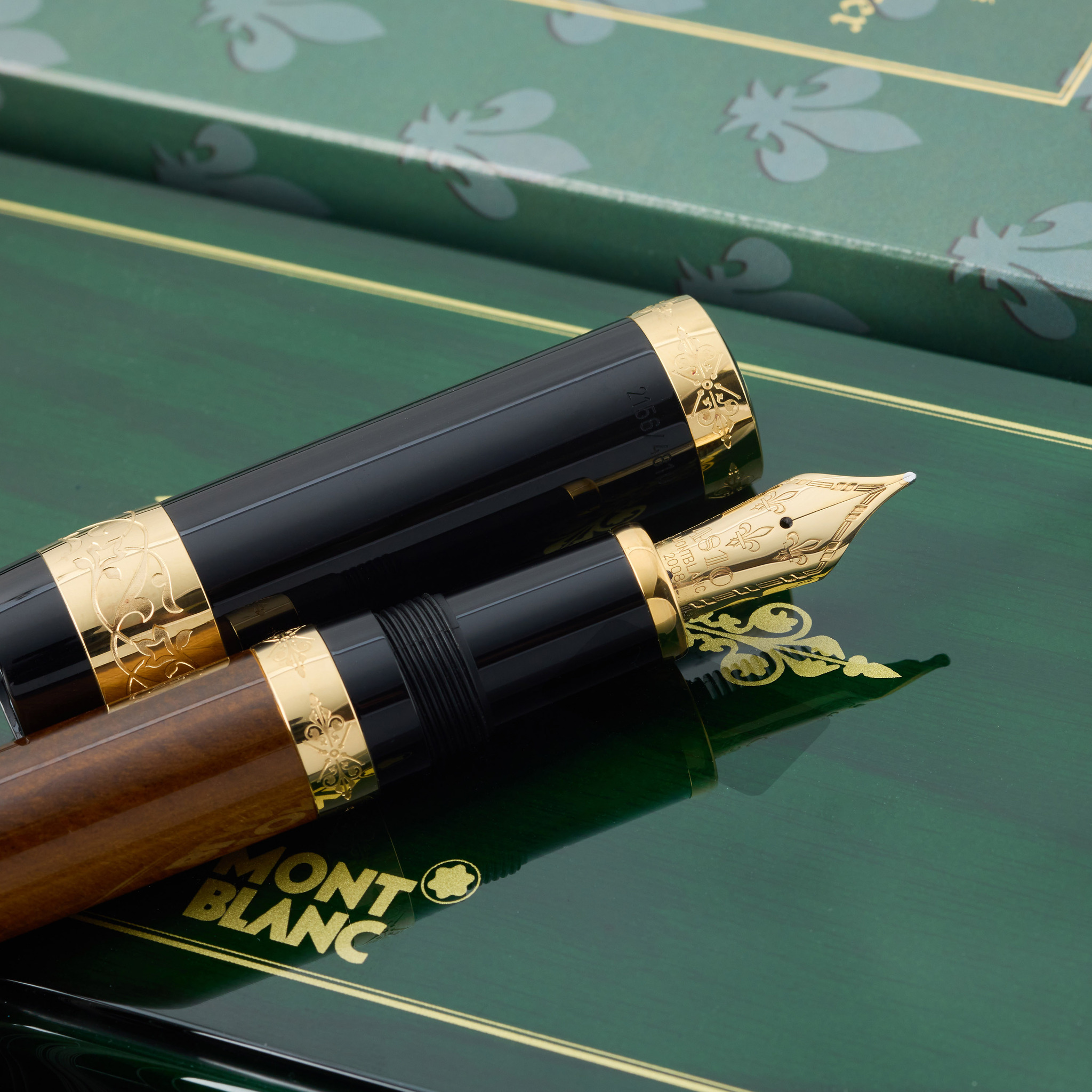 A fine and rare fountain pen. Montblanc Patron of Art Edition: François I: Limited to 4810 pieces (2008). The cap made in deep-black precious resin with gold-plated fittings are elaborately engraved in the Renaissance style. The pen body combines golden-brown shimmering tiger's eye and deep-black precious resin to represent truly royal radiance, with medium 18K yellow gold nib engraved with three lilies (fleurs-de-lys), emblem of the French royalty.