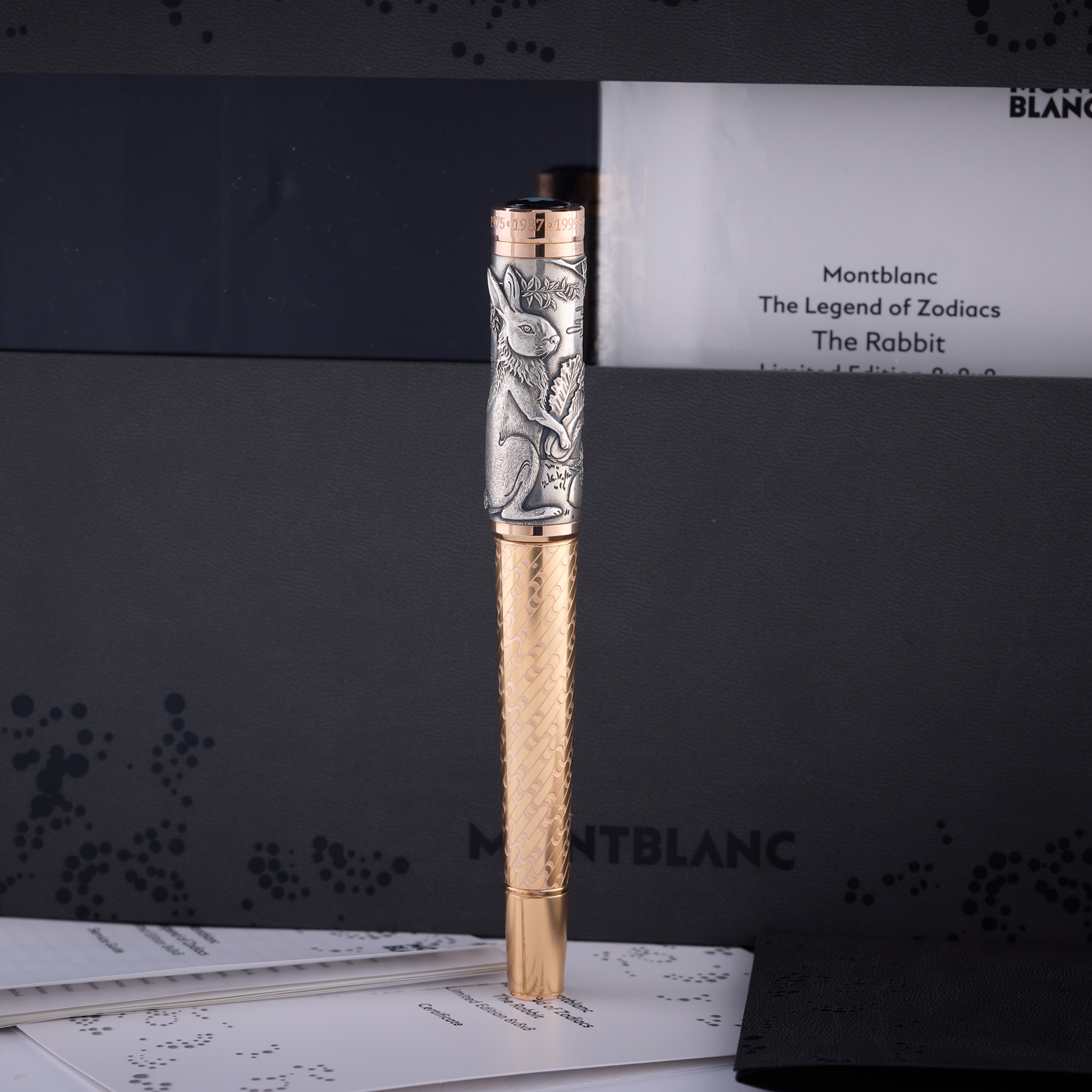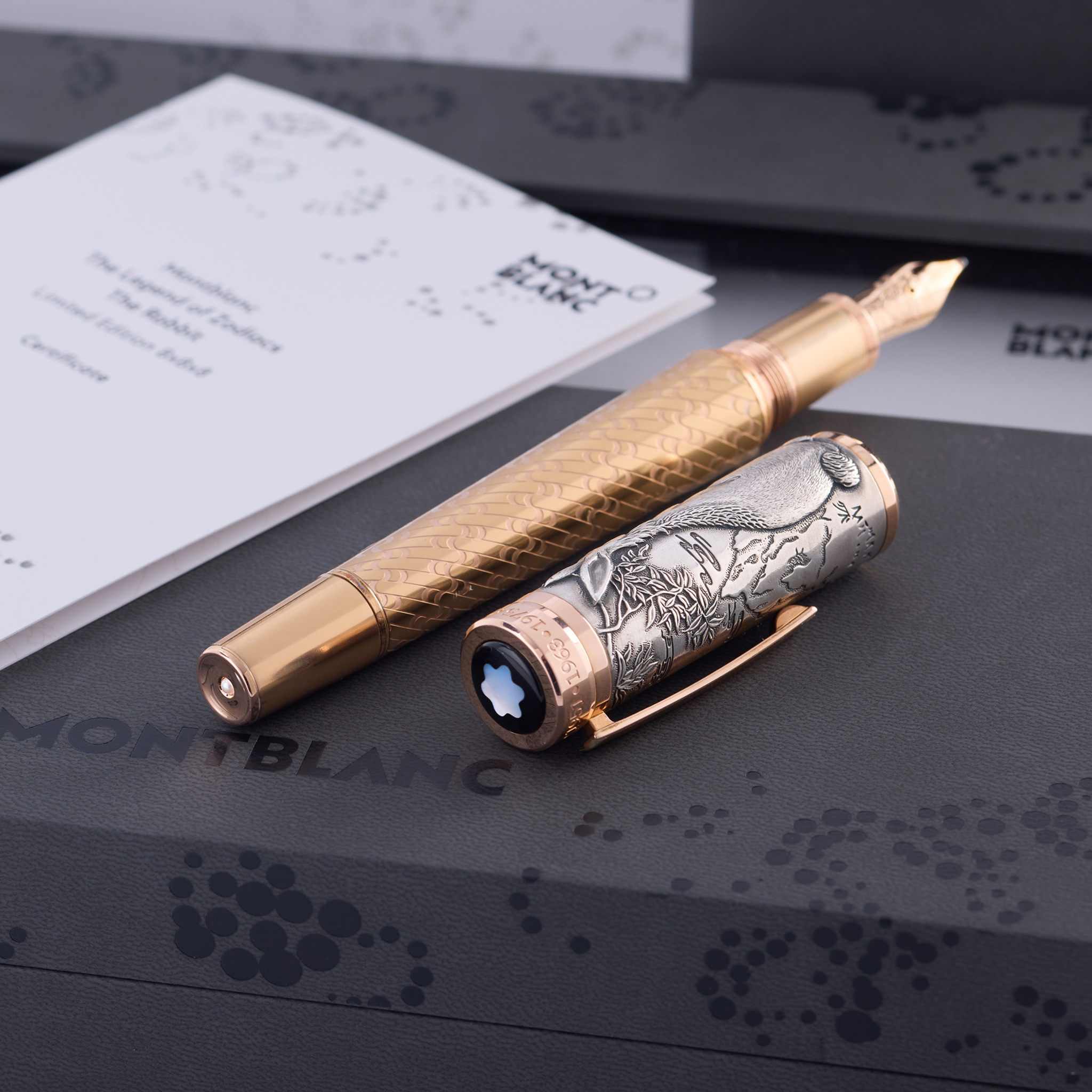 A fine and rare fountain pen. The Legend of Zodiacs - The Rabbit: Limited to 512 pieces (2022). The barrel and cap is crafted in pink gold-plated and sterling silver with hand-engraved scene rich with symbolism to bring good luck and fortune to the new year, including a rabbit, an osmanthus tree, a carrot and radish, and a mountain. The cap is crowned with the Montblanc emblem in mother-of-pearl and engraved with the Year of the Rabbit, “2023”, along with the previous six years associated with the sign. The “lucky cloud” is decorated on the barrel with a pearl set on the end of the barrel and a 18K gold medium nib embossed with the rabbit.