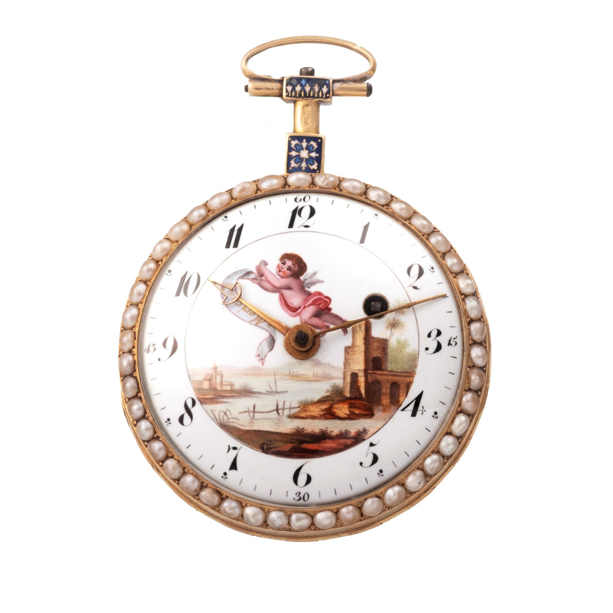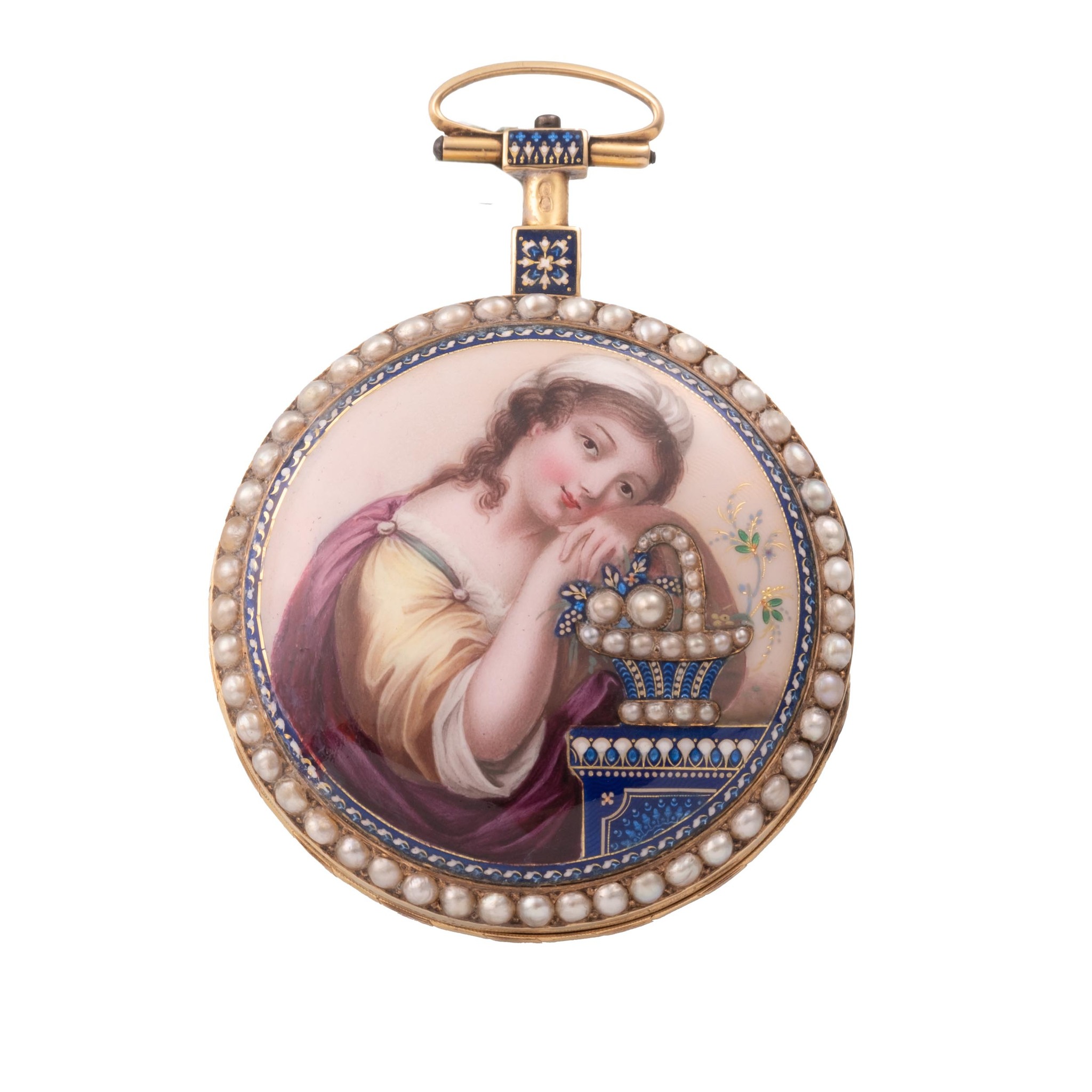 A very fine and rare, 18k gold, manual wind painted on enamel and pearl-set, pocket watch with painted on enamel dial. The bezels set with split pearls, the back set with a painted on enamel portrait of a lady leaning over a pearl-set basket on a plinth decorated with gold paillons. The center of the dial is painted with a putto holding a signature banner over a landscape. Gold hands.