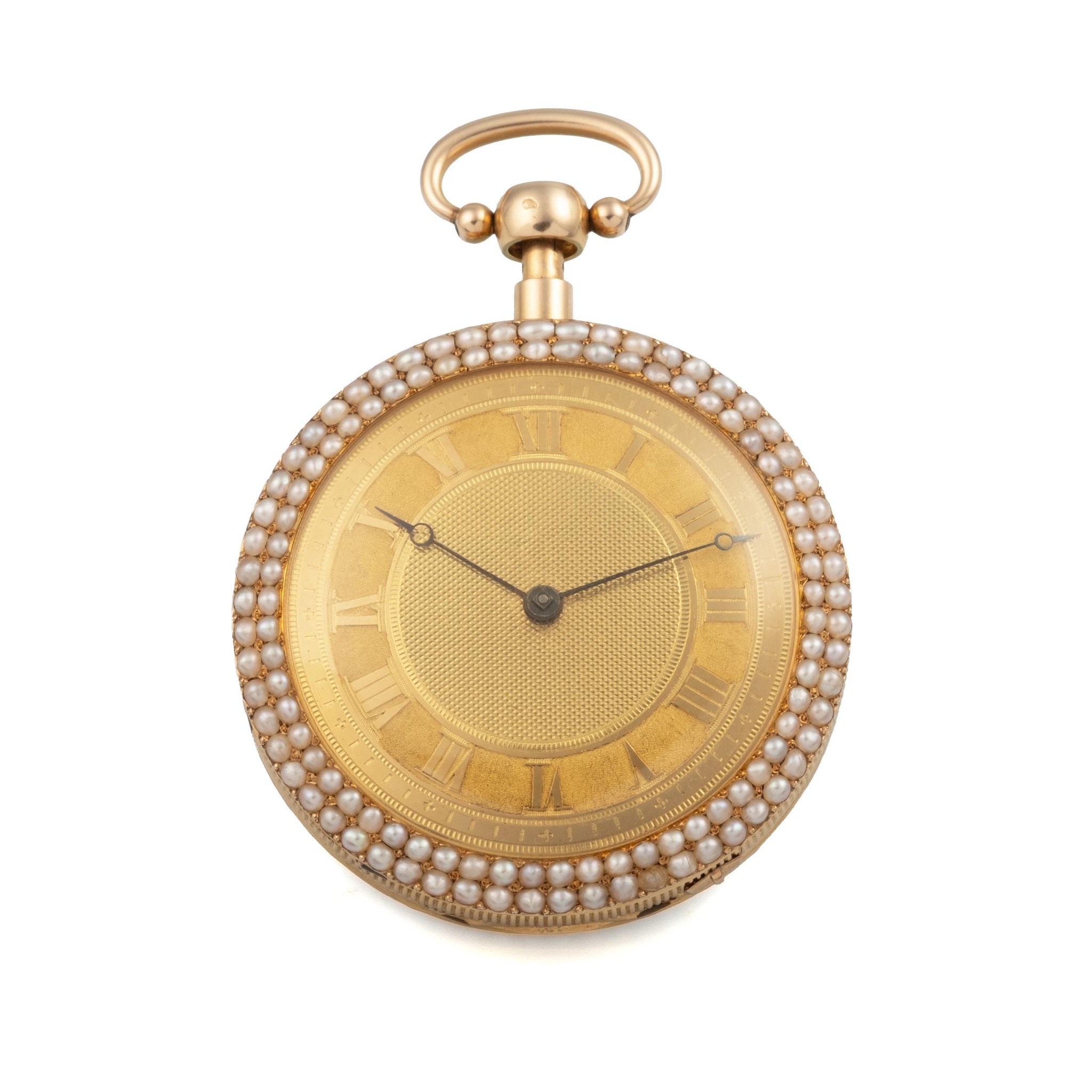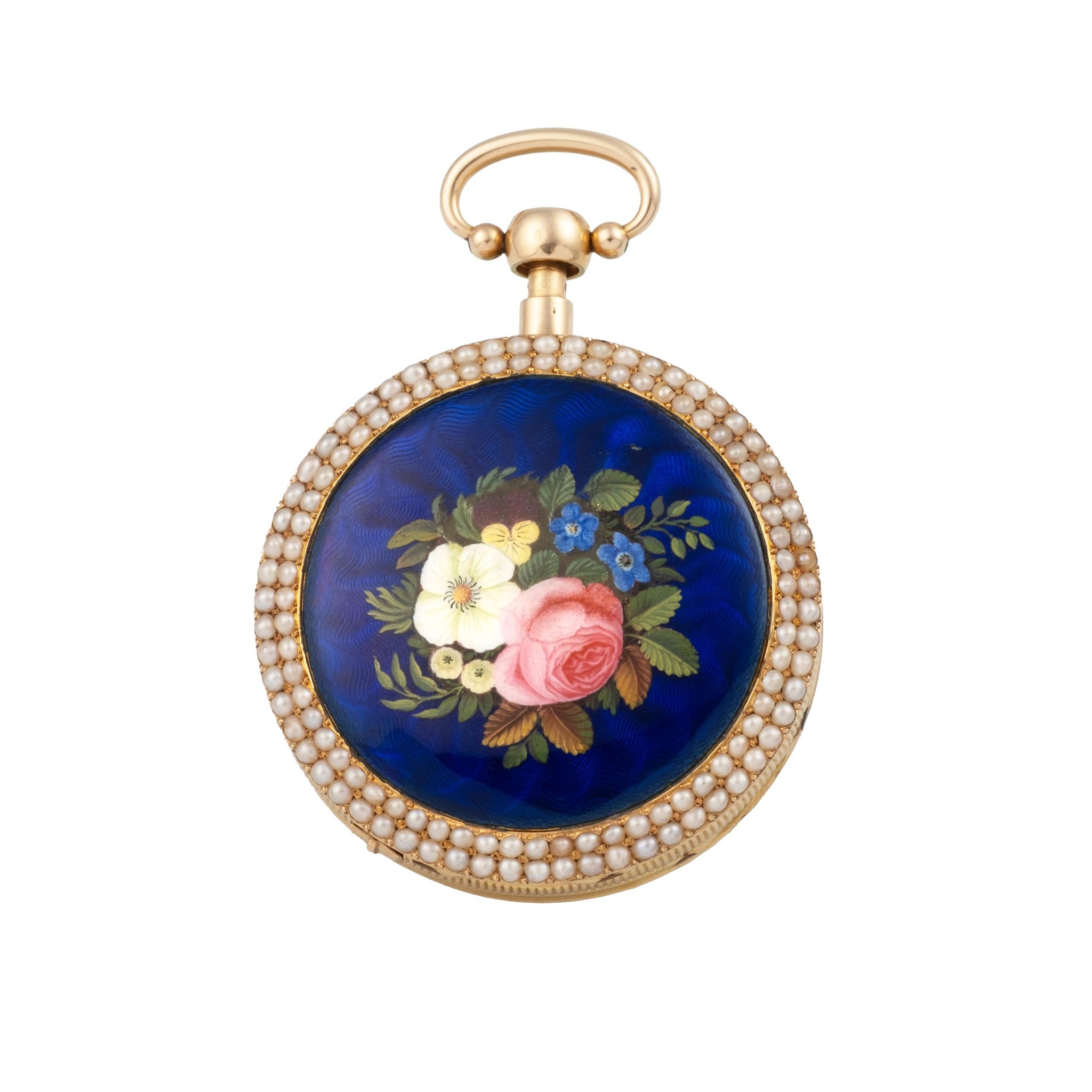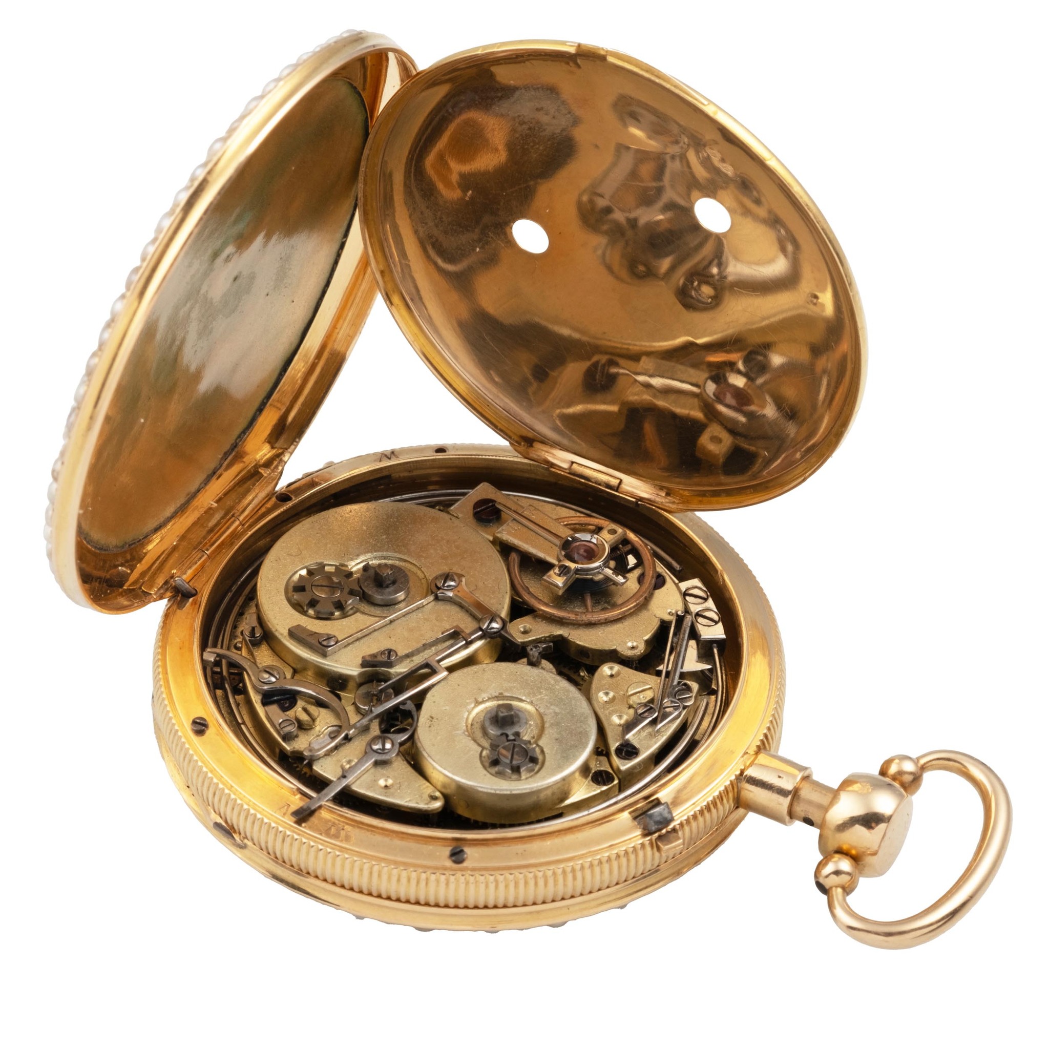 Caliber 33 mm., cylinder escapement, gold balance, flat balance spring, balance and escape wheel jeweled, repeating on gongs by depressing the pendant, disc-type musical train with fixed barrel, 17 tuned teeth alternating on both sides of the pin disc, striking on the hour or on demand.