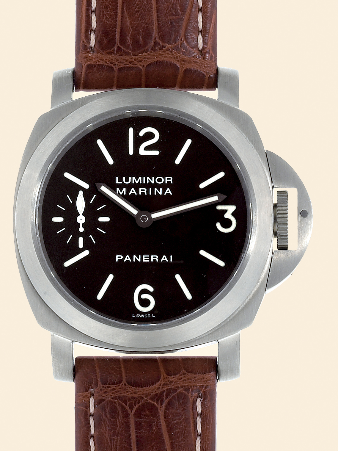 C. Three-body, brushed, screwed-down case back, straight lugs, patented winding-crown with security lever to wind the watch even under water, sapphire crystal. D. Black with luminous Arabic numerals and indexes, subsidiary seconds dial at 9. Luminous black "baton" hands. M. Cal. OP XI, rhodium-plated, special Panerai decoration, 17 jewels, straight-line lever escapement, monometallic balance, shock absorber, self-compensating flat balance spring. Dial, case and movement signed. Dim. 44 X 44 mm. Thickness 14 mm