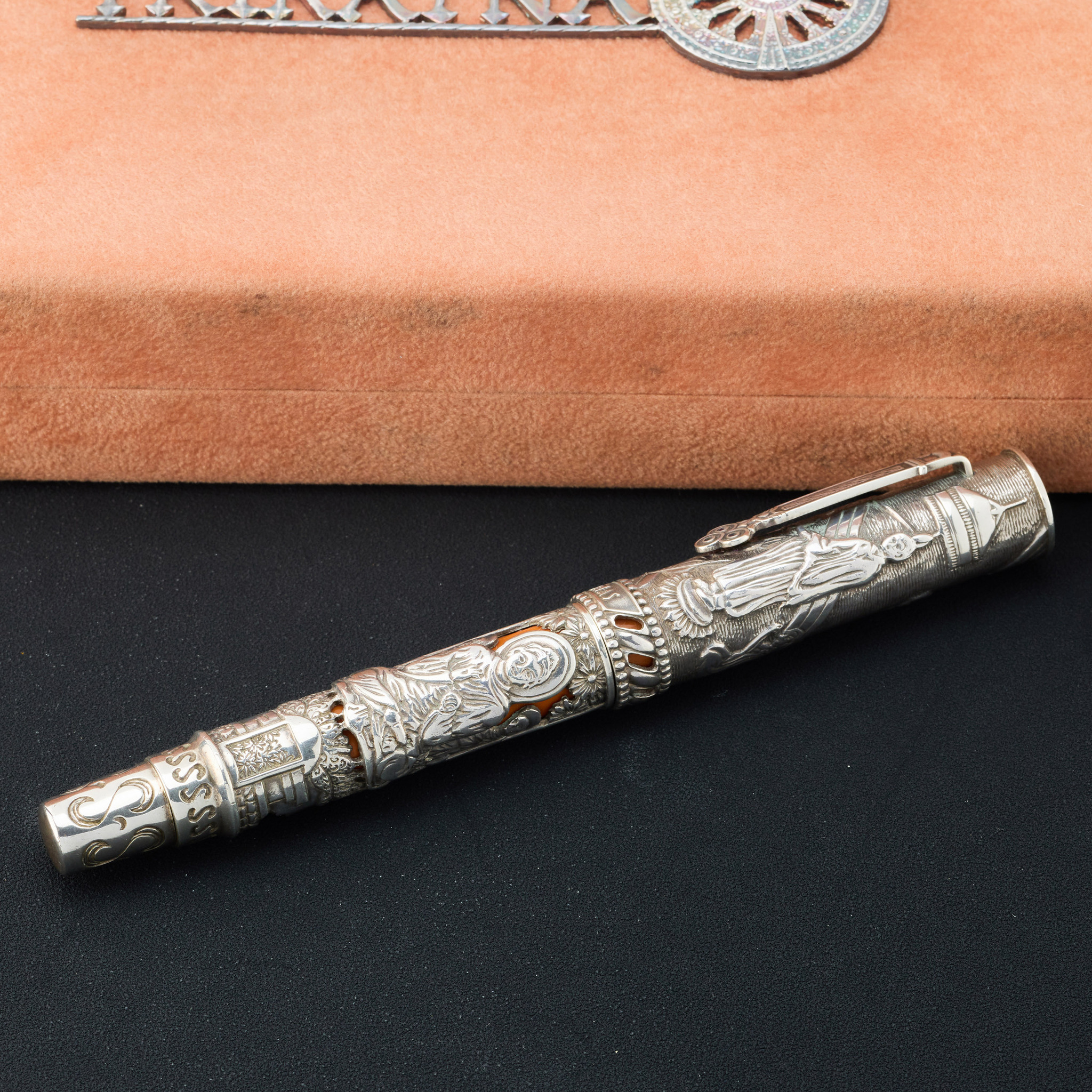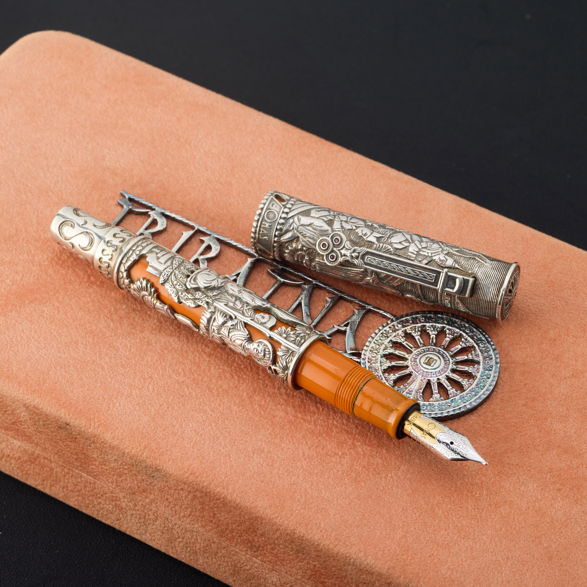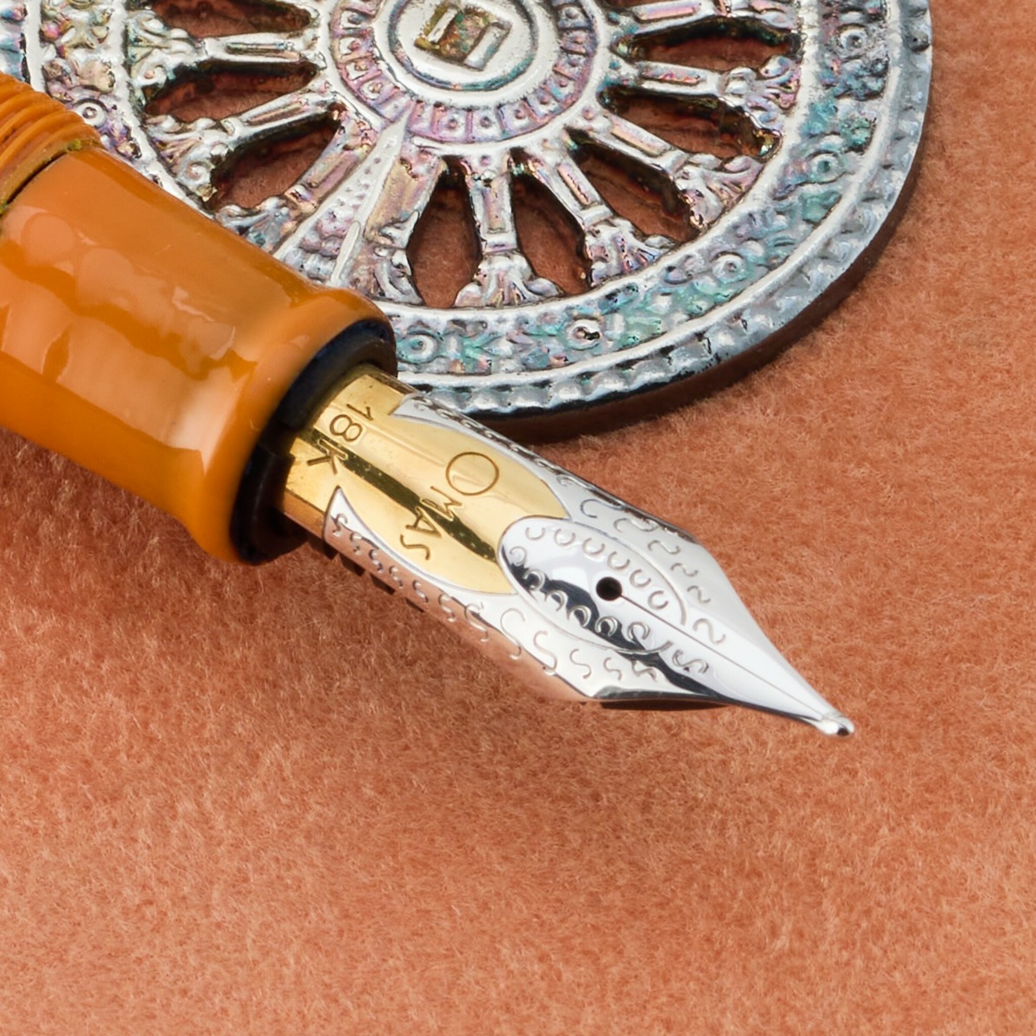 A fine and rare, limited edition fountain pen. Omas Triratna Buddha: Limited to 1997 pieces. The barrel and cap are crafted from 925 sterling silver and yellow-orange resin, featuring intricate hand-sculpted motifs. The barrel showcases Buddha seated on an ornate throne, performing the hand gesture of teaching the sacred doctrine, surrounded by floral and stone decorations. The cap depicts a scene from an ancient tapestry, illustrating Buddha descending from heaven, with his followers gesturing in joyous respect. A filigreed wheel, symbolizing the Dharma teaching, is inlaid on the top, while the OMAS logo is featured on the cap band. The sterling silver clip is adorned with three rubies, and the two-tone 18K gold nib is embellished with platinum details.