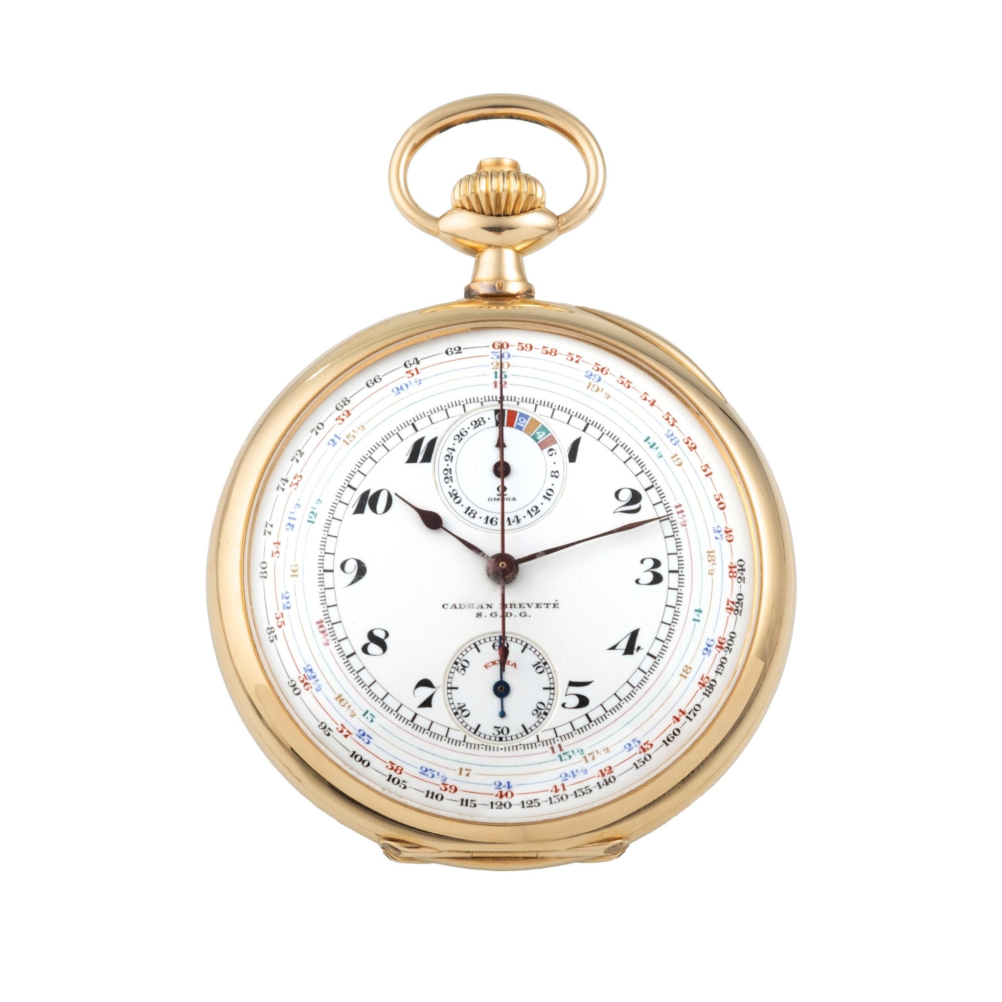 OMEGA, SWITZERLAND, CADRAN BREVETÈ S.G.D.G, CHRONO-TACHYMETER - COLORED MULTISCALE, 18K YELLOW GOLD