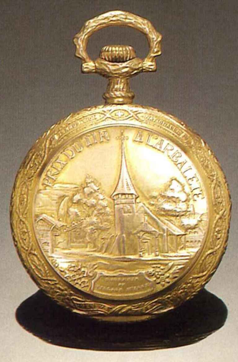 C. Three body, massive, "bassine et filets", the band pendant and bow chased with a floral decoration, the bezels marked: "Exposition Nationale - Genève 1896", the back with a village landscape marked: " Souvenir du Village Suisse". Hinged gold cuvette engraved with the awarded prize. D. White enamel with Arabic numerals, outer minute ring and sunk subsidiary seconds. Gold "Louis XV" hands. M. 18"', gilt brass, 18 jewels in screwed settings, straight line lever escapement, cut bimetallic balance, Breguet balance spring with swan neck micrometric index. Omega trade mark punched on the balance bridge. In very good condition. Diam. 53 mm.