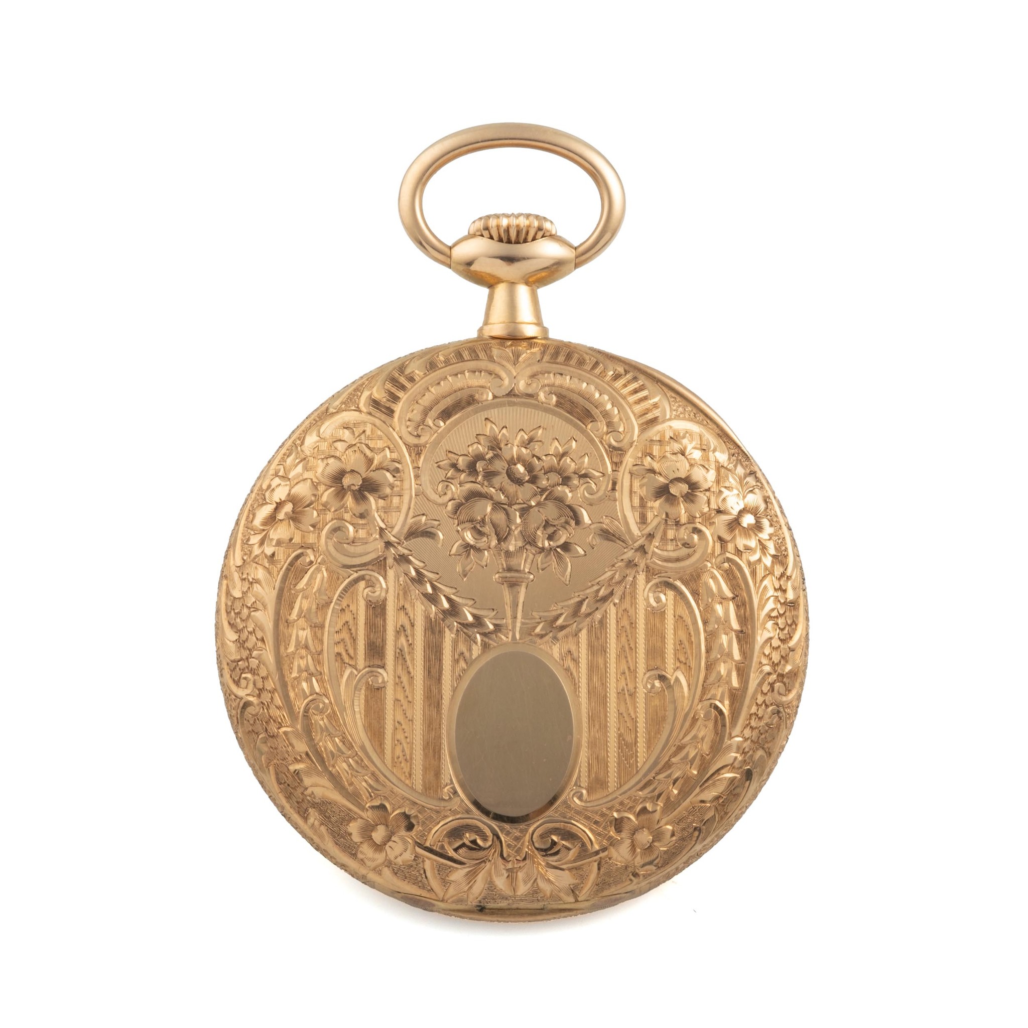 A very fine and elegant, 18k gold, manual wind open face, keyless, Art Nouveau pocket watch with white enamel dial. Case back with engraving decoration.