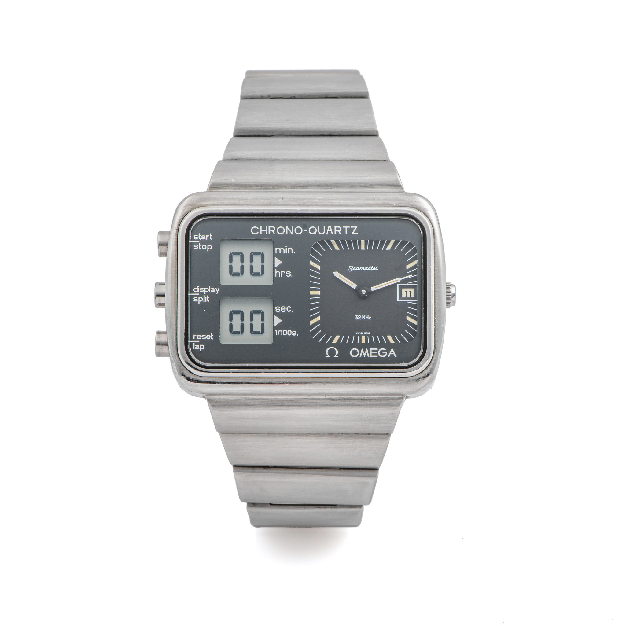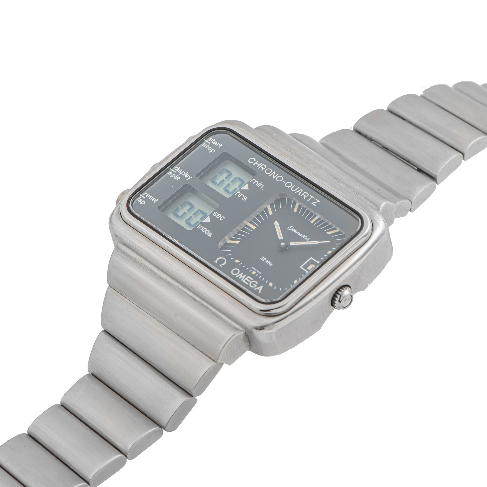 The “Chrono-Quartz” is regarded as the first hybrid electronic watch, having both an analogue display for the time functions and a double liquid crystal digital display (LCD) for the chronograph functions. The chronograph can measure to 1/100th of a second.